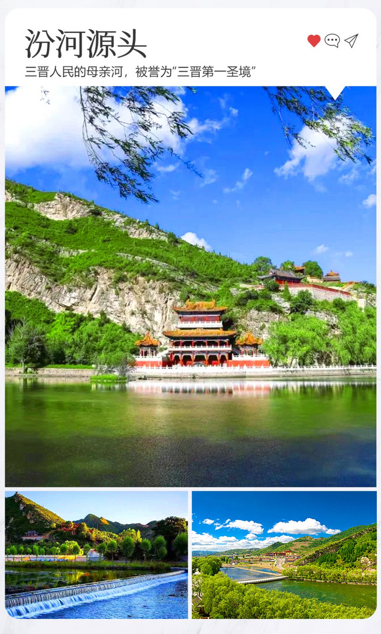 ·【汾河源头】汾河源头是三晋人民饮水思源、寻根感恩的母亲河。汾源四周九山汇聚,溪流淙淙,亭台楼榭,风光旖旎。源头有一水塘,塘上石壁刻有“汾源灵沼”四个大字,壁上雕有一个龙头,龙口中喷出一股清泉,终年流淌不绝。雷鸣寺、魁星阁挺立楼子山上,沾汾河之灵气,气象不凡。自古以来就有三晋第一胜境之美誉。