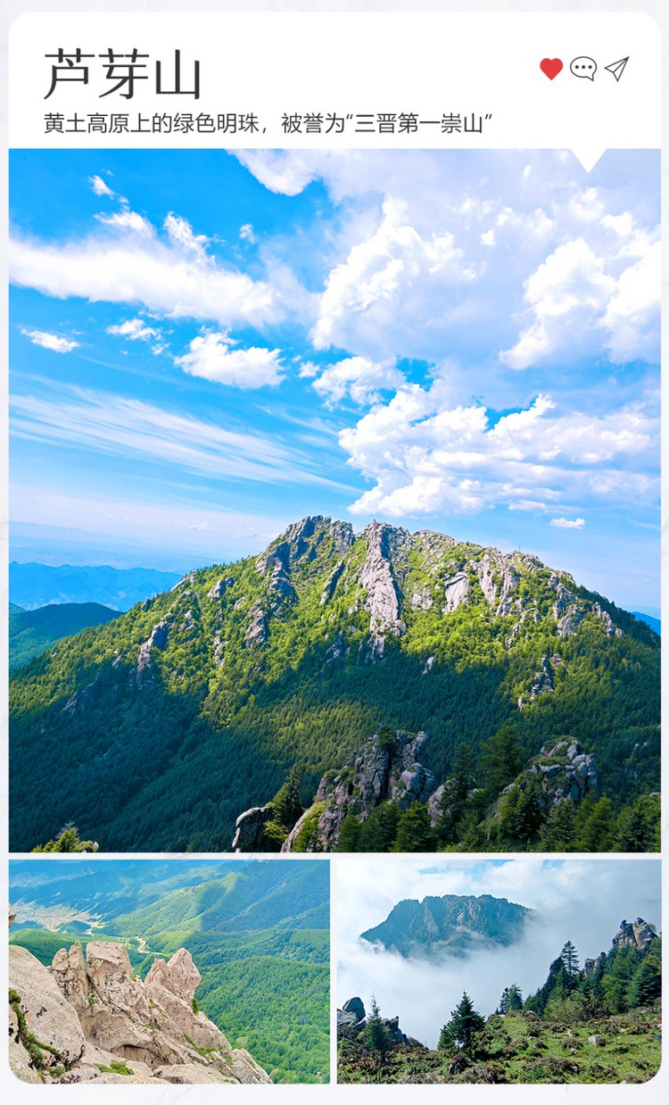 芦芽山景区位于山西省忻州市宁武县,是国家AAAA级旅游景区,国家级自然保护区,同时也是佛教名山和毗卢佛道场。这里自然风光壮丽,文化底蕴深厚,是一个集休闲、观光、探险于一体的绝佳去处。