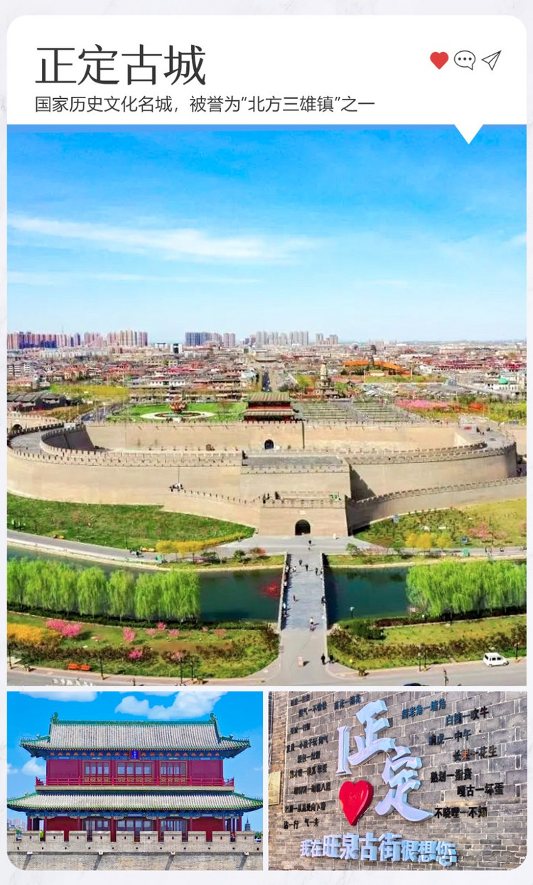 ·【正定古城】有着“三山不见 ,九桥不流 。九楼四塔八大寺,二十四座金牌楼”之称。 城外有明代古城墙,城内有古旧的祠堂、沧桑的寺庙、复古的街道,体现的确实另一种历史沧桑和往事温情。它位于石家庄的怀抱之中,是一座历史悠久的古城池,宛如一颗被岁月精心雕琢的宝石,散发着璀璨而独特的光芒。它拥有7000年的人文史、2700多年的建制史、1600多年的建城史,是河北省的重要历史遗址,也是探访古城文化的理想之地。正定古城,名胜古迹众多,文化积淀深厚,堪称是“古建筑宝库”。古城内有隆兴寺、临济寺澄灵塔、天宁寺凌霄塔、广惠寺华塔、文庙、赵云庙等一大批人文景观。穿梭在古街古巷中,一砖一瓦都在诉说着这座千年古城的往日尘烟。