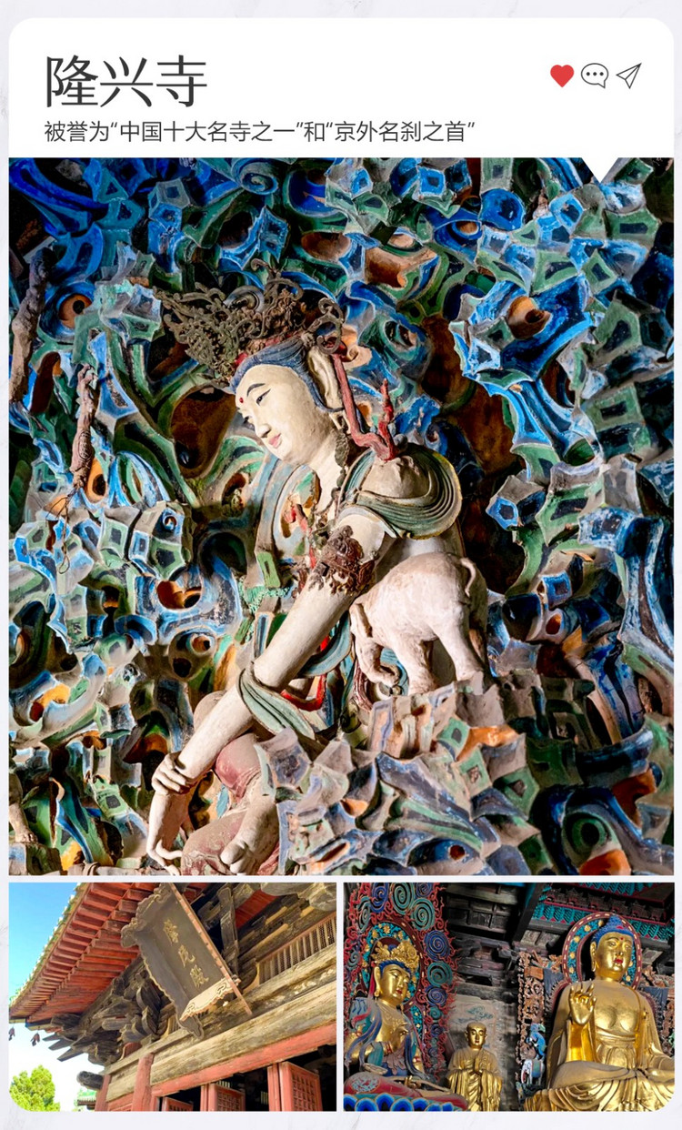·【隆兴寺】隆兴寺,别名大佛寺。国家4A级景区,是中国十大名寺之一,是中国国内现存时代较早、规模较大且保存完整的佛教寺院之一。这座镶嵌在河北省石家庄市正定县城东门里街的璀璨明珠,自古以来便是佛教文化的重要传承之地,也是中国现存规模最大的宋代佛教寺院,被梁思成先生称之为“京外名刹之首”。踏入隆兴寺的那一刻,仿佛能感受到一股宁静与祥和的气息扑面而来。寺内有六处建筑或文物被称为全国之最:五彩悬塑自在观音,被誉为“东方美神”、铜铸千手千眼观音像、铜铸毗卢佛像、宋代建筑的杰作——摩尼殿、中国最古老、最大的木结构转轮藏、“楷书之祖、隋碑第一”之称的龙藏寺碑。寺庙内的佛像庄严肃穆,尤其是21米的千手观音令人震撼,而那些古老的建筑和壁画,更是让人仿佛穿越到了古代,亲身感受着佛教文化的深厚底蕴。