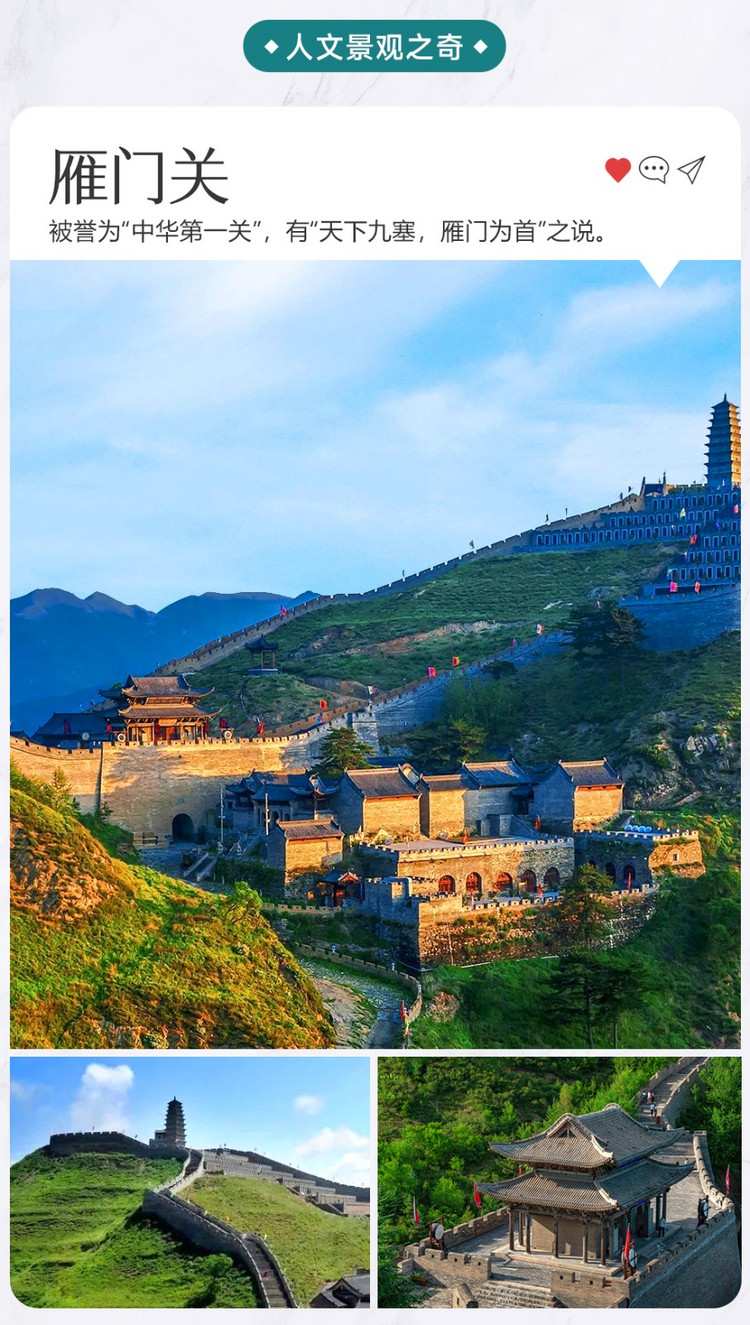 打卡景点:后腰铺、景区名人壁、明月楼、雁门关村、豹突泉、边贸街、瓮城门、地利门及宁边楼、关署、天险门及关楼、关城城廓、镇边祠、古关道、云际泉及雁池、关陵及壮士亭、盘古石、云际泉及雁池、观音殿、 分道碑、阜家坪、前腰铺