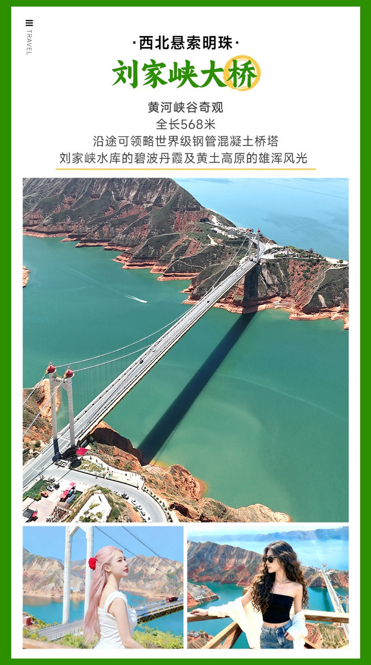 接着乘车前往【刘家峡大坝】(车程约40公里,用时约1小时,游玩约1小时),刘家峡水库位于黄河上游,被誉为“高原明珠”,水库地处高原峡谷,黄河在这里转了一个九十度急弯,如同天门紧锁在悬崖峭壁之间,驰骋在"甘肃ZUI美公路"沿黄观光路上,黄河风情尽收眼底。