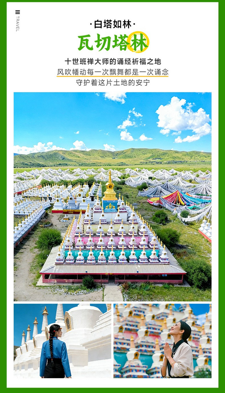 吃完早餐后,我们前往世界ZUI大经幡塔林【瓦切塔林】(车程约230公里,用时约5小时,游玩约1小时),数百座五彩经幡塔连绵如迷宫,随风诵经。108座白塔群:象征佛教108种烦恼的解脱,这里还有绝美湿地倒影,夏季水草丰美,经幡倒映在湿地中超级美,早晚光线柔和时,经幡色彩ZUI鲜艳。