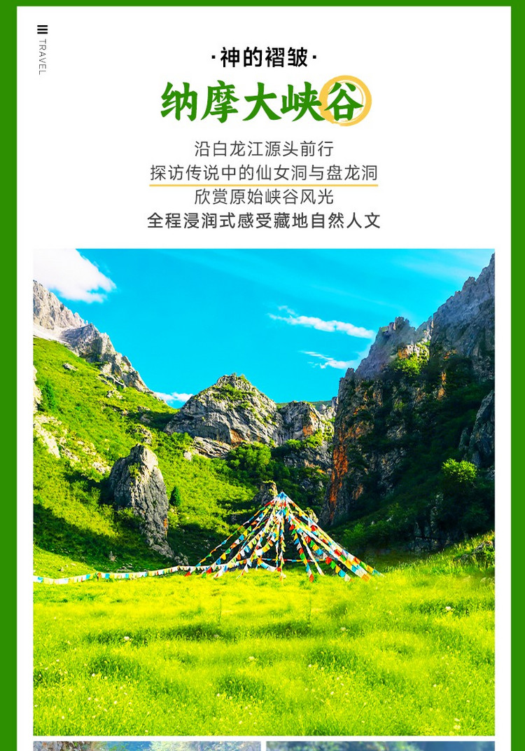 接着我们沿着白龙江的源头,徒步进入【纳摩大峡谷】(徒步约2小时),徒步强度不大,老少皆宜。峡谷两边峭壁高耸,道路狭窄,之后就有步入桃花源的感觉,复行数十步,则豁然开朗。我们在怪石、清泉、峭壁与草甸的交织中,感受这片宁静的净土。