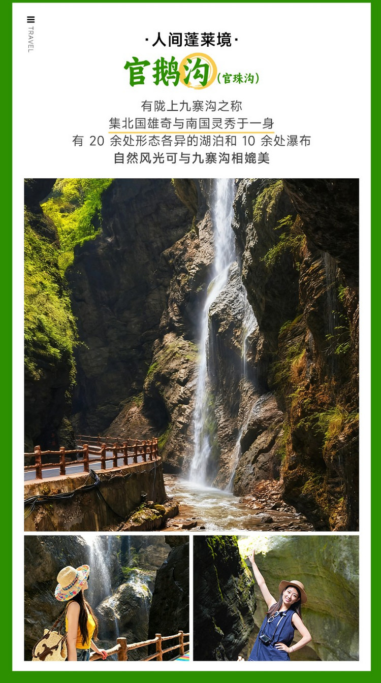 早餐后,来到中国超具潜力的小众美景【官鹅沟】(车程约15分钟,游玩时间约3-4小时)。官鹅沟是西北十大神奇地理奇观之一 ,藏于陇南宕昌的山水秘境,被誉为"北方小九寨"。这里峡谷与飞瀑共舞,雪山同湖泊相映,构成一幅原始而灵动的画卷。