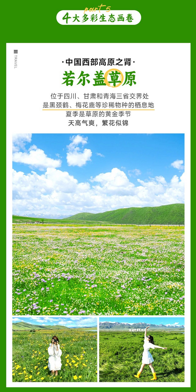 早餐后,我们前往【若尔盖花湖】(车程约100KM,车程约2小时,游玩约3-4小时),镶嵌在川西北高原的“天空之镜”,是中国ZUI美的湿地明珠之一。夏季来临,3000余亩的湖面化作缤纷花毯,狼毒花、格桑花与鸢尾花在碧水间肆意绽放,黑颈鹤优雅掠过如镜湖面,留下圈圈涟漪。木质栈道蜿蜒深入湿地,倒映着流云与远山,仿佛行走在水天交界处。秋日水草泛金,冬季冰晶凝玉,四季轮回间始终保持着遗世独立的纯净。