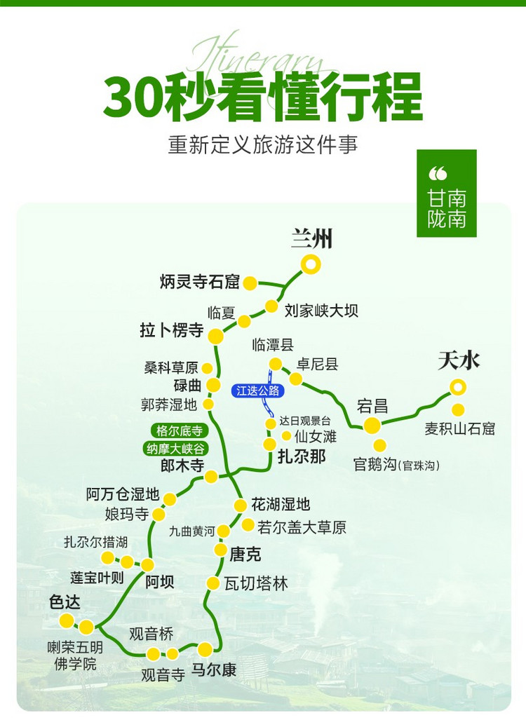 2、行程结束当天18:00左右抵达兰州西站,大家可以依据自己的时间,自行选择继续游玩或是启程回家。火车/高铁建议购买19:00以后的车次,飞机建议购买20:00以后的航班。兰州火车站距离兰州中川机场约68公里,车程约1.5小时。兰州站距离机场大巴客运中心站徒步300米,到达机场71公里,用时1小时25分钟左右,大家根据自己的航班车次选择返程票。