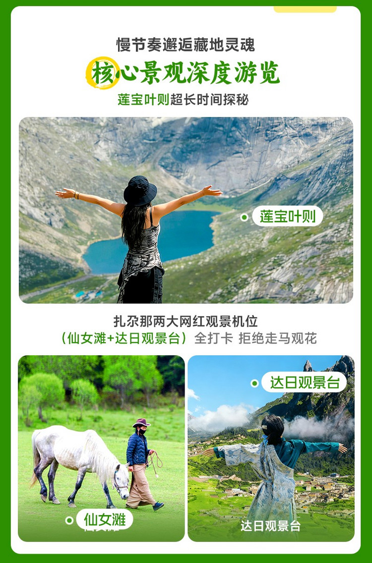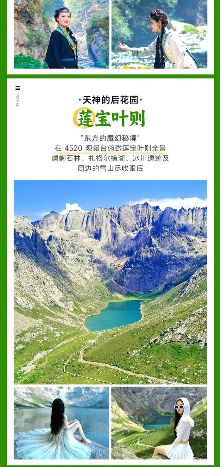 下午,我们进入中国ZUI具潜力的秘境美景【莲宝叶则】(车程约130公里,用时约3小时,游玩约4-5小时)。莲宝叶则风景区山峰平均海拔在4000米以上,是藏区著名的神山。莲宝叶则藏语意为:尊严的玉石之峰。其内奇峰兀立,云雾缭绕,湖泊星罗棋布。我们将徒步至海拔4250米的【扎尕尔措湖】,欣赏圣湖与刀劈斧削的冰川角峰的完美结合,并挑战【4520观景台】,将这片雄伟奇崛的石山镜湖尽收眼底。