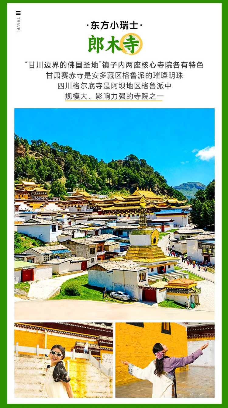 适时前往“东方小瑞士”【郎木寺镇】(车程约100公里,用时约2小时),首先参观甘肃境内的【赛赤寺】(游玩约1小时),寺院金顶在阳光下熠熠生辉,建筑气势恢宏。随后步入四川境内的【格尔底寺】,其内供奉着百年不腐的活佛肉身,有佛缘即可参观。
