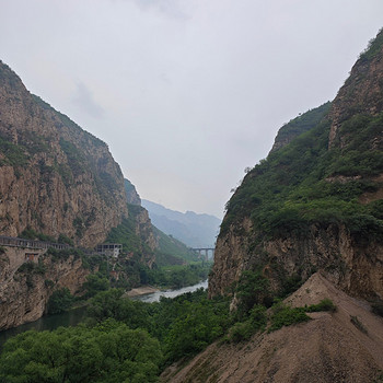 明艳的黄色防护墙,如同丝带般缠绕在葱郁的绿意山腰。独特的石灰岩地质,嶙峋刚毅,在盎然生机中拔地而起,撑起一片绿意汹涌下的巍峨。山体褶皱深刻,诉说着亿万年时光的故事。脚下是蜿蜒曲折的峡谷公路,时而紧贴峭壁,时而悬于半空。那一段段惊险又绝美的挂壁公路,是嵌入山体的奇迹,更是摄影师镜头下无法抗拒的构图天堂。每一个转弯,都框出一幅新的山水大作。峡谷底部,永定河水奔腾不息,泛着跳跃的白浪,冲刷着宽窄不一的河床。两岸绿树成荫,农田阡陌纵横,是粗犷山水中点缀的温柔生机。而高耸入云的巨大桥墩,如同现代文明的钢铁脊梁,沉默而坚定地跨越这古老的河谷,在自然画卷中刻下力量的印记。一阵山雨初歇,薄纱般的雾气自苍翠的山头袅袅升起,缠绕林间,朦胧了峭壁的轮廓,为峡谷披上神秘的诗意。恰在此时,一列火车宛如游龙,不疾不徐地从云雾缭绕的谷间、从壮丽的桥梁之上悠然穿过,完美融入这幅流动的水墨丹青。