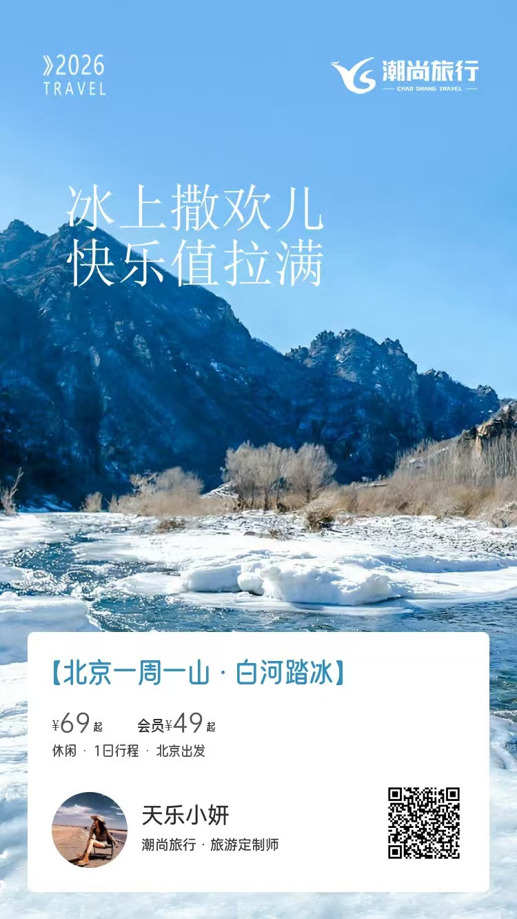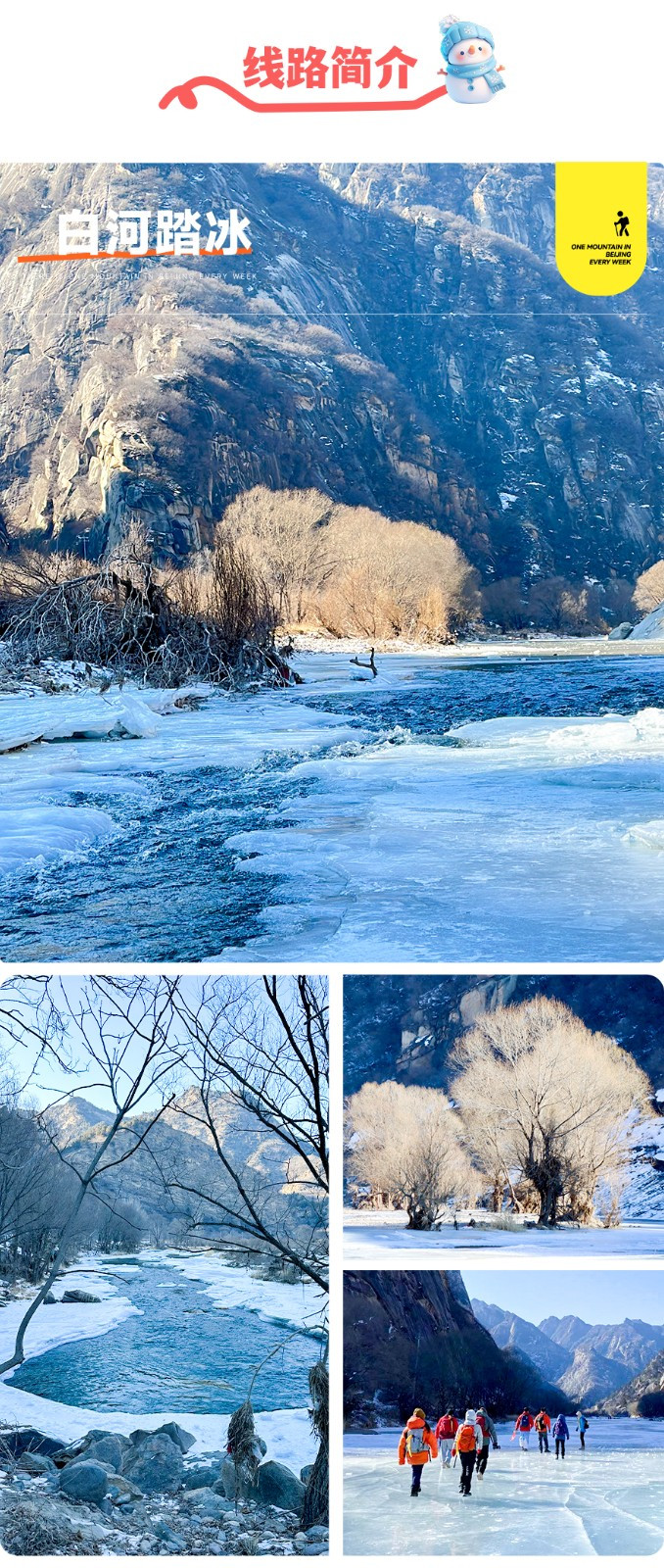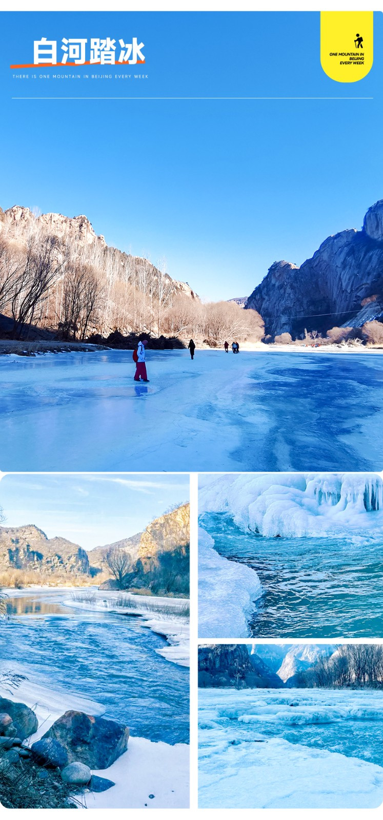 白河大峡谷被誉为“北京的小雅鲁藏布江”, 因其壮丽的峡谷风光和原始风貌而闻名,与永定河宫厅山峡、拒马河峡谷并称“京都三大峡谷”。冬季(通常12月底至次年2月)冰冻期河面结冰坚实,适合踏冰徒步,冰层厚度可达近一米,部分区域冰下仍有暗流,形成晶莹的冰瀑和冰河景观。可在冰面上徒步,欣赏冰瀑、冰河等自然景观,体验独特的探险乐趣。