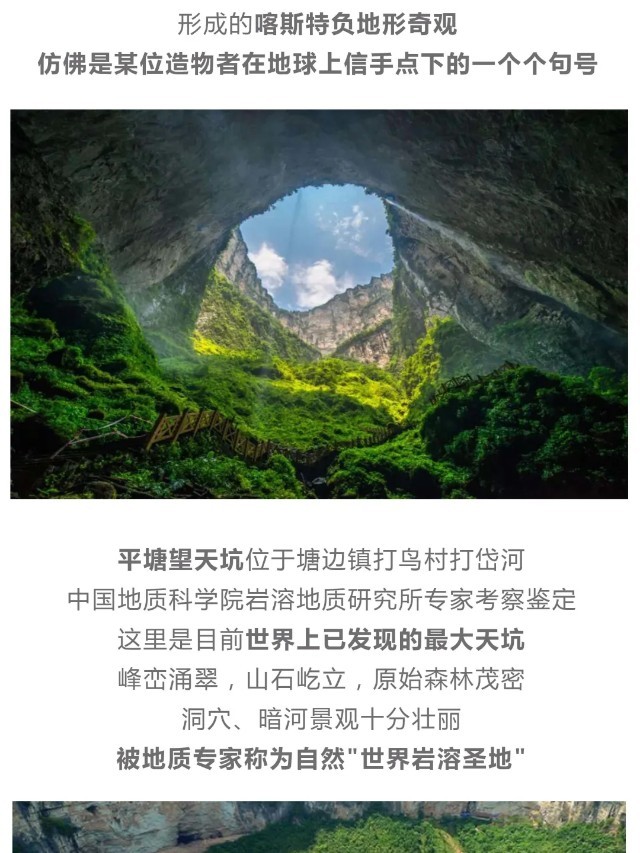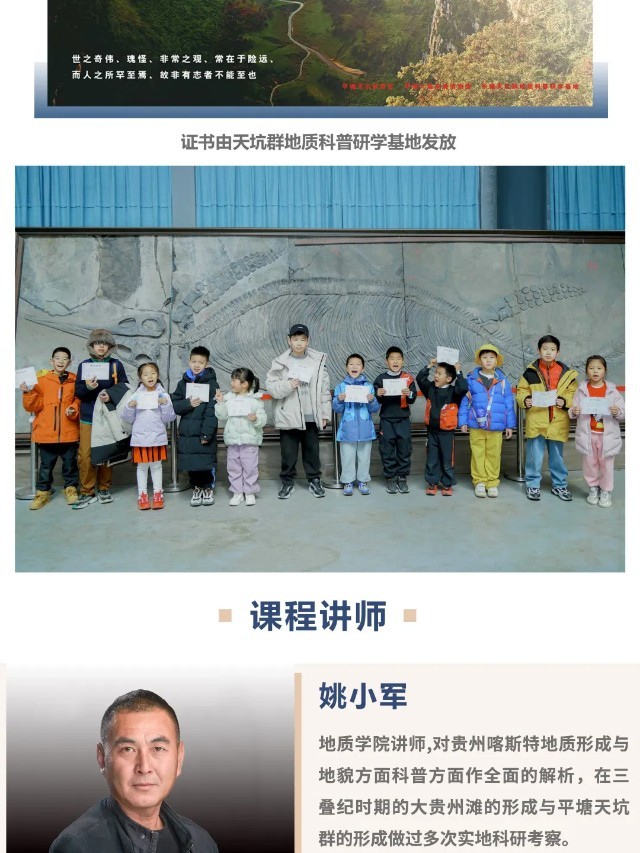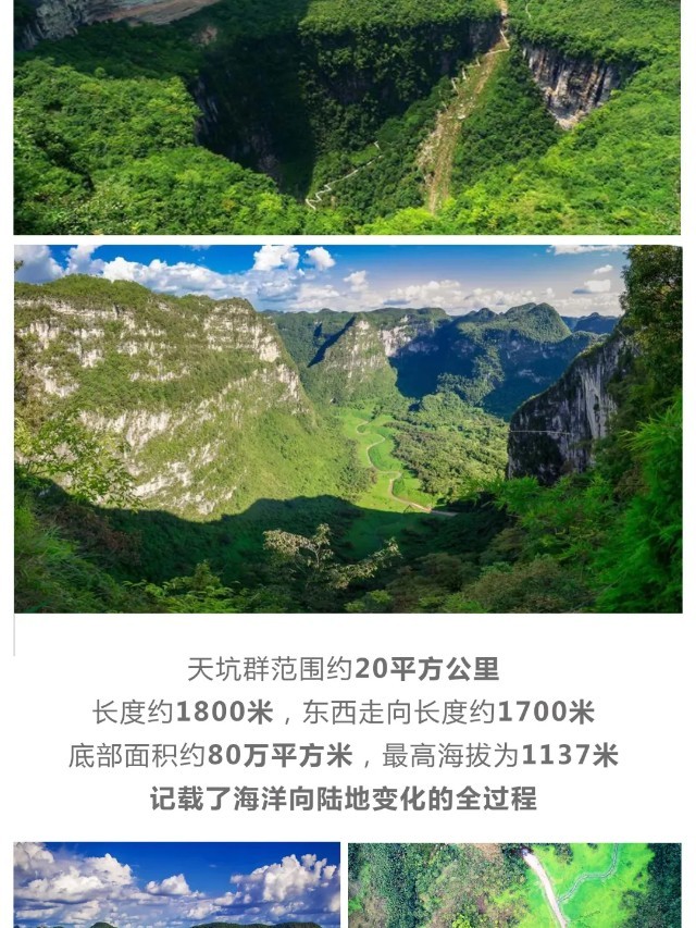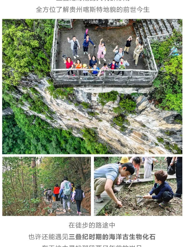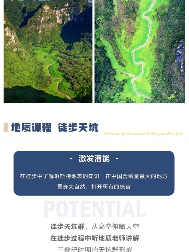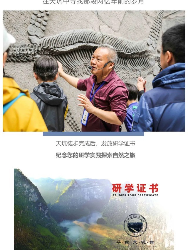 早餐后我们前往【徒步探寻】“大贵州滩”享誉“天坑博物馆”之称的世界最大天坑~打岱河天坑、最陡峭最险峻的道坨天坑和秀美的夏家坨天坑,亲近自然,了解自然,沿途由景区导师讲解“大贵州滩”的由来;了解“大贵州滩”三叠纪时期海洋向陆地演变过程中海洋生物贵州龙、海百合的灭绝和化石的形成,触摸地球生命的进化与发展;了解大自然的神奇魅力和演变轨迹,激发同学们了解自然、探索自然的热情。