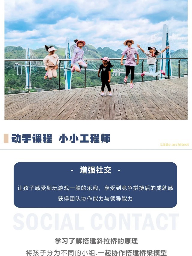 平塘特大桥为249.5m+2×550m+249.5m的叠合梁斜拉桥。其主塔采用钻石形索塔,整体呈花瓶形状,主塔塔高为320m。桥位地势陡峭、地势高差大、场地狭窄,垂直气候特征明显素有“天空之桥”的称号,我们将在【天空之桥博物馆】中,科普了解贵州的桥梁艺术,并以小组为单位,亲手搭建【桥梁模型】提高团队协作能力,化身小小工程师。