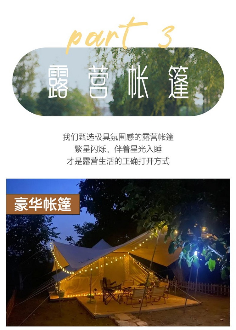 5、设备:轻奢装备(克米特折叠椅、蛋卷桌、天幕、氛围串灯、装饰等);
