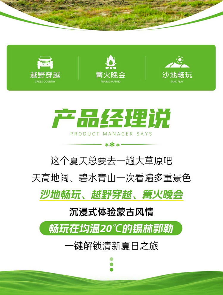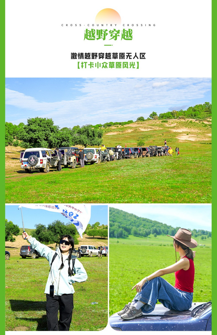 穿越草原无人区,体验原生态风光美景。越野车穿越,玩遍原始草原,沙漠,森林,湿地四大地貌,欣赏了草原美景,感受了越野车穿越草原的刺激,收获满满。