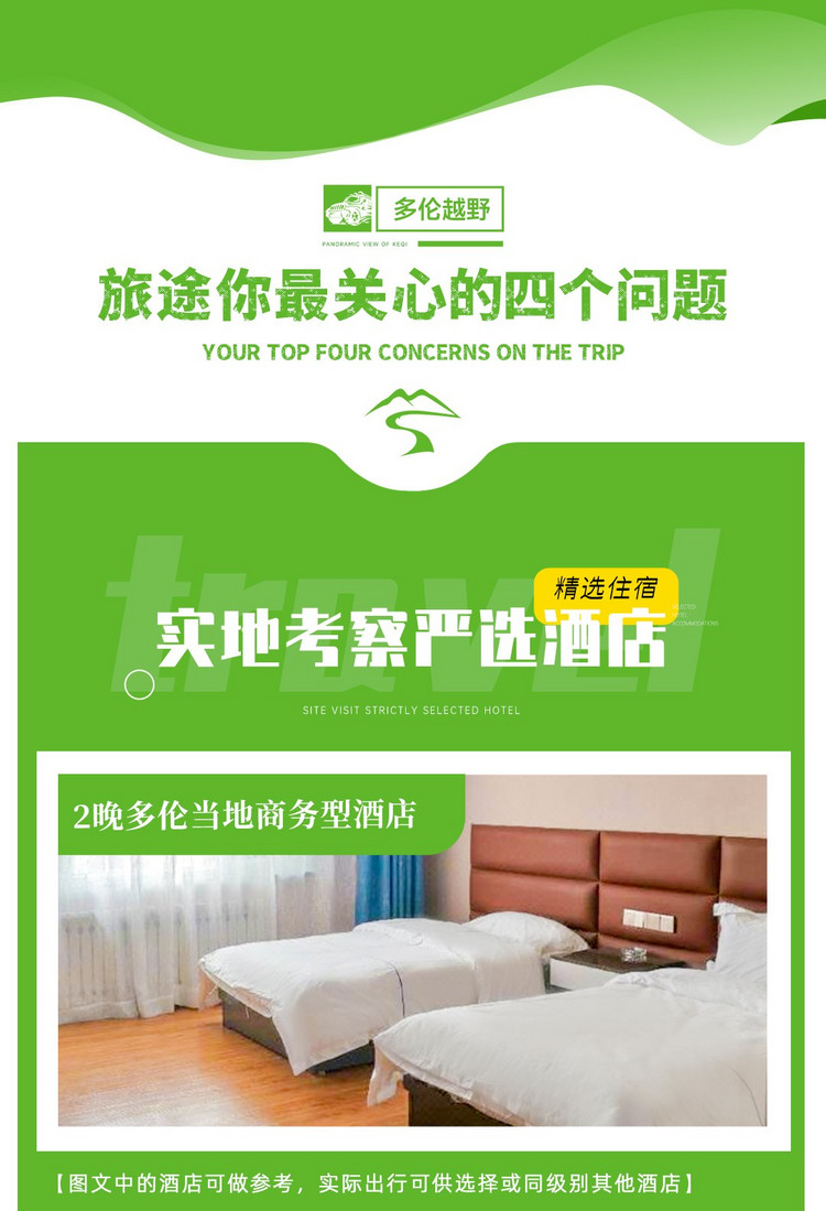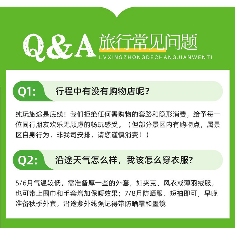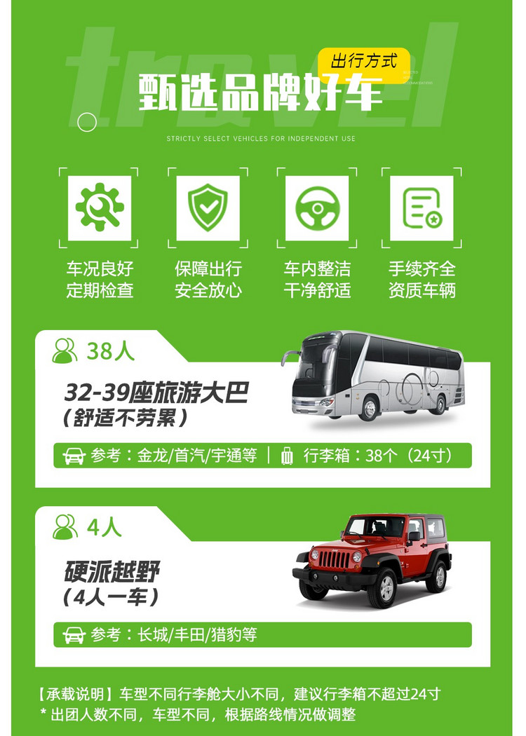 2、以上行程时间及顺序供参考,受天气、交通、景区调控及队员体能等不同影响有可能会调整,以领队实际安排为准。