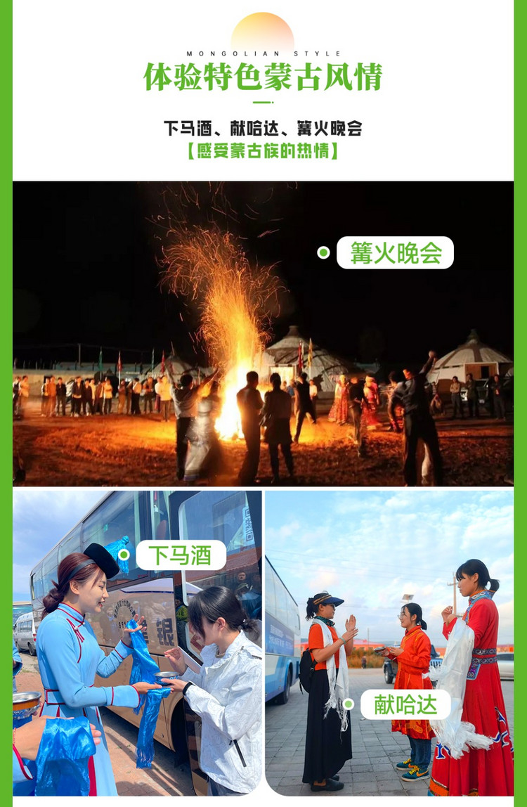 游玩结束我们前往【蒙古风情园】,在这里准备了草原上神圣的敬酒仪式--【下马酒】【献哈达】,身着蒙古族盛装的蒙古姑娘双手托着哈达,端着盛满马奶酒的银碗,迎面而来;