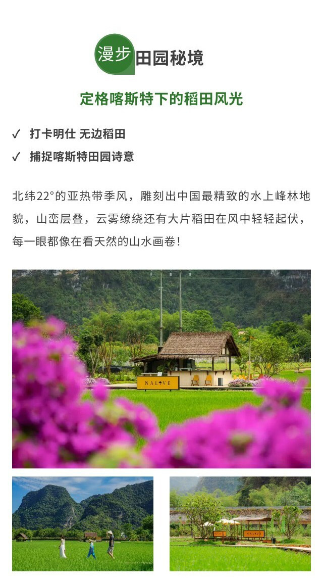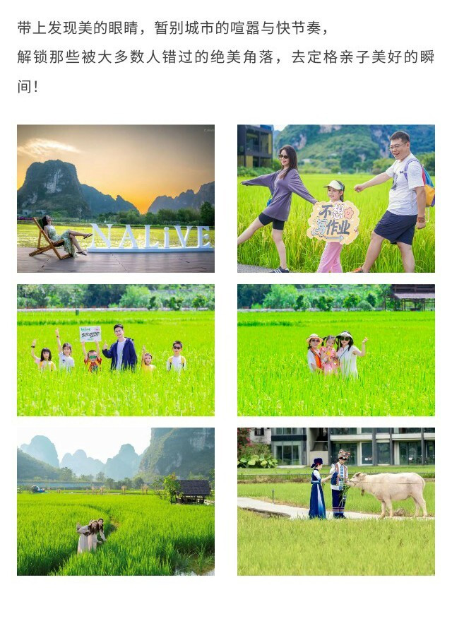 午餐后前往【明仕那里稻田美拍】,漫步于喀斯特群山环抱的无边稻田,捕捉稻浪与峰林交织的诗意画面,在无边山水中完成一组【亲子田园大片】,定格光影中的美好瞬间。
