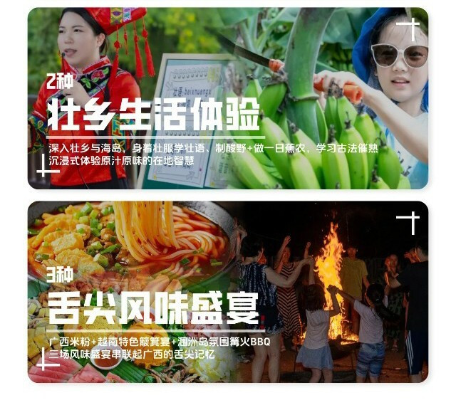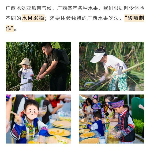 下午沉浸式体验在地壮族村民生活,小朋友们将【换上壮族服饰】,跟着当地人学壮语,【瓜果采摘】,动手做广西独特的水果吃法【酸嘢】,在实践中深入了解壮族饮食文化。