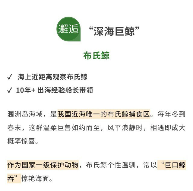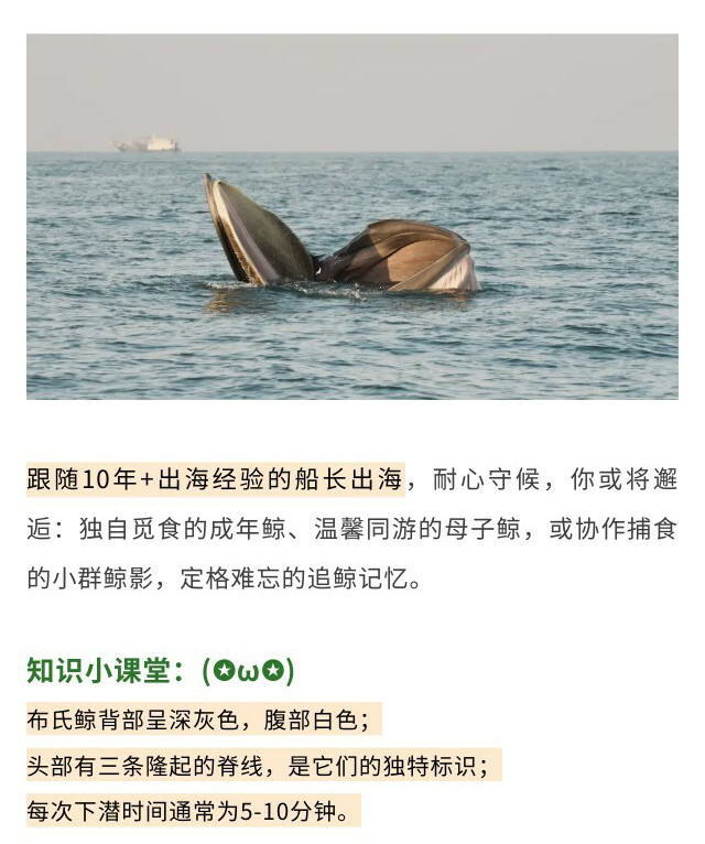 下午在专业船长带领下【乘船出海寻布氏鲸】,寻访冬季洄游至涠洲岛海域的布氏鲸。学习观察鲸群活动规律,在碧波之中近距离见证“海洋巨兽”跃出水面捕食的震撼瞬间,上一堂生动的海洋生态保护课。