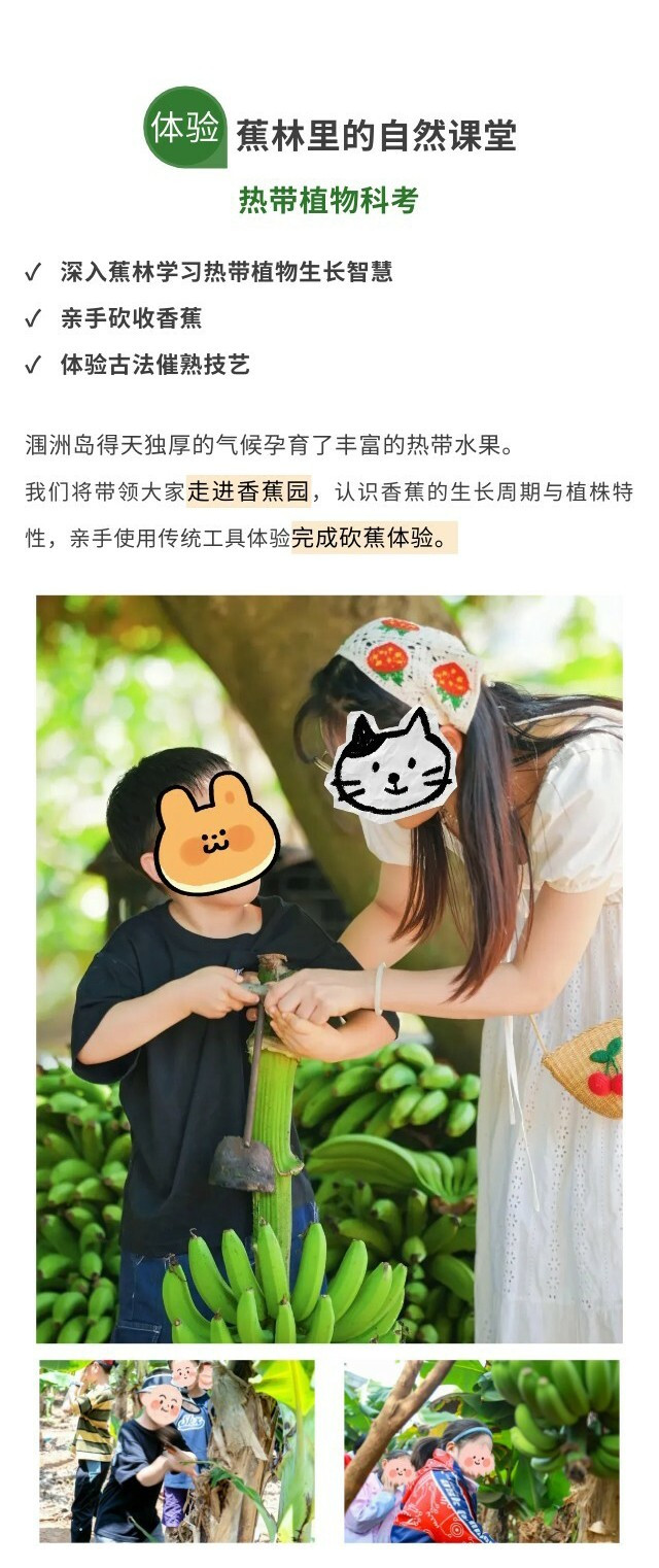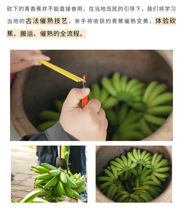 登岛后,直接前往香蕉林开启【热带植物科考】。在当地岛民的指导下,亲子家庭将亲手体验【砍香蕉】,学习代代相传的【古法催熟】技艺,了解热带水果从采摘到餐桌的全过程,感受岛屿农耕文化的独特魅力。