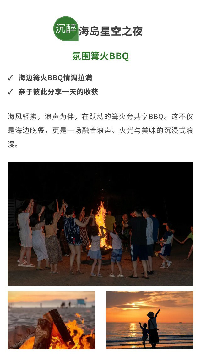 夜晚在海边举办【氛围篝火BBQ】,亲子围坐在篝火旁,分享一日探险趣事,在星空与海浪声中,享受惬意温馨的岛屿之夜。