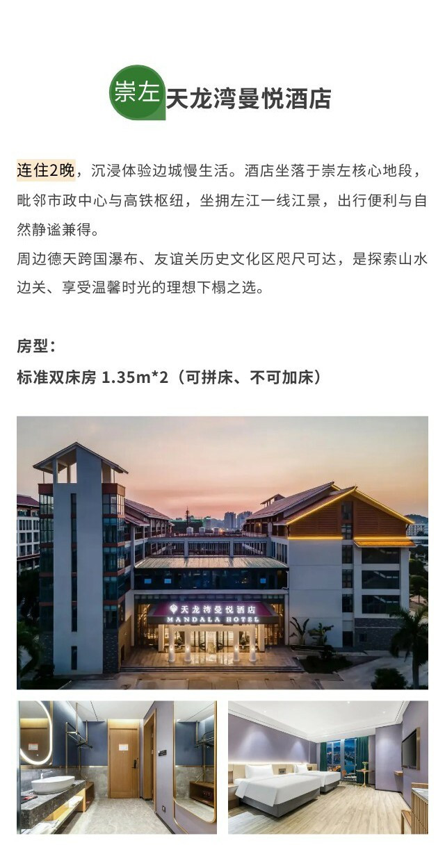 傍晚前往【太平古城】,自由探索这座重现壮乡风情的文化古镇。华灯初上时,漫步青石板街,欣赏夜景,感受壮族建筑与边关文化的交融魅力。