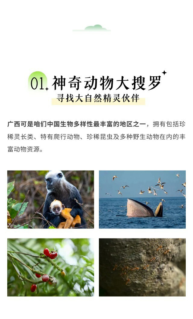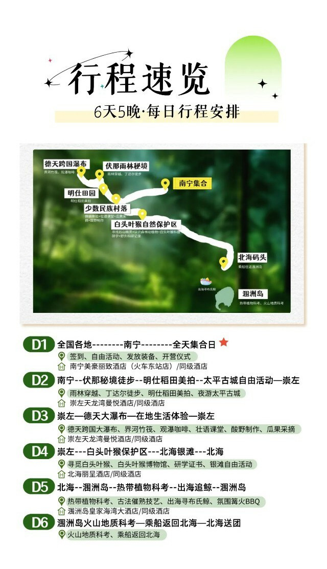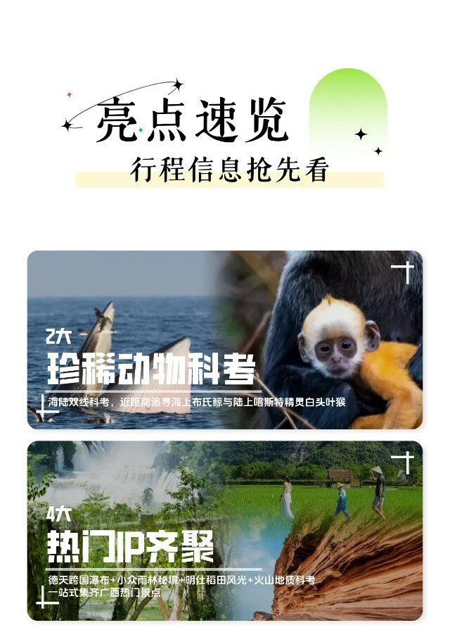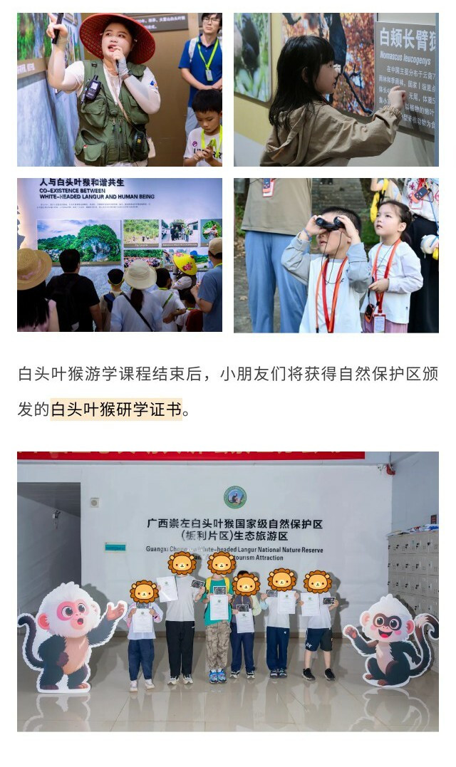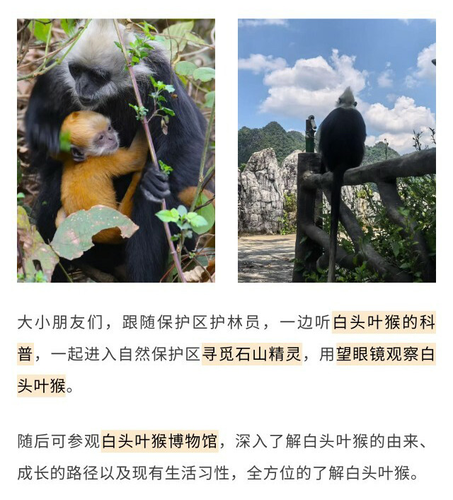 早餐后前往【白头叶猴自然保护区】,在护林员的陪同下【观察白头叶猴】,进行野外科研记录和生活环境调查。参观【白头叶猴博物馆】,了解白头叶猴的基本生活特征和生活习惯。游学结束后,将获得保护区颁发的【白头叶猴研学证书】。