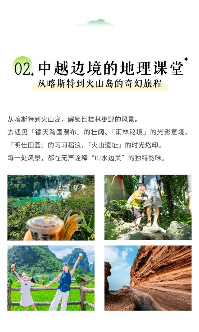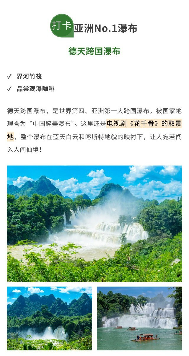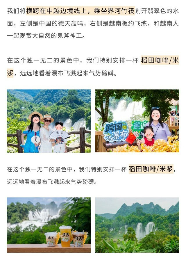 早餐后,前往世界级景观——【德天跨国大瀑布】,乘坐【界河竹筏】近距离感受瀑布飞溅的雨丝,旁边就是越南板约瀑布,越南商贩可能会跟你兜售越南咖啡等等小商品。继续往上走手捧一杯【稻田咖啡】远眺瀑布,别有一番风情。
