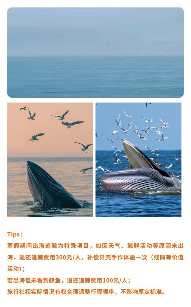 寒假期间出海追鲸为特殊项目,如因天气、鲸群活动等原因未出海,退还追鲸费用300元/人,补偿贝壳手作体验一次(或同等价值活动);