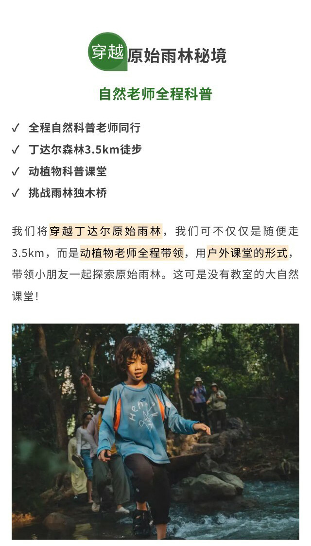 中午抵达【伏那秘境】,这是一块非常小众的秘境,我们将和小朋友一起挑战【丁达尔徒步】,全程约3.5KM,徒步中有动植物科普老师,边走边讲,开启【自然户外课堂】。