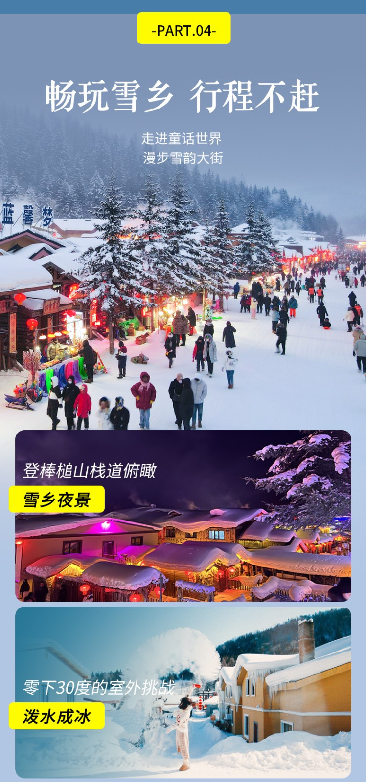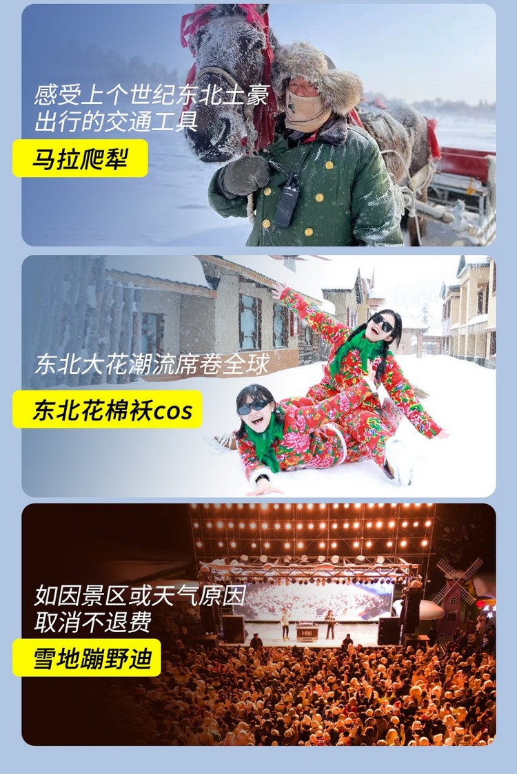 16 : 00接下来在雪乡内自由玩耍,可以走走雪韵大街,欣赏雪房子,寻找雪蘑菇,还可穿上乡村特色的花棉袄COSPLAY。东北冬季日落时间非常早,大约四点多的时候天就已经黑了,可以漫步棒槌山栈道,俯瞰【雪乡夜景】红红的灯笼映在洁白的雪地上。也可参加雪乡景区举办的雪地蹦迪晚会,(如遇景区原因或大风等天气原因不举办不退费用)。