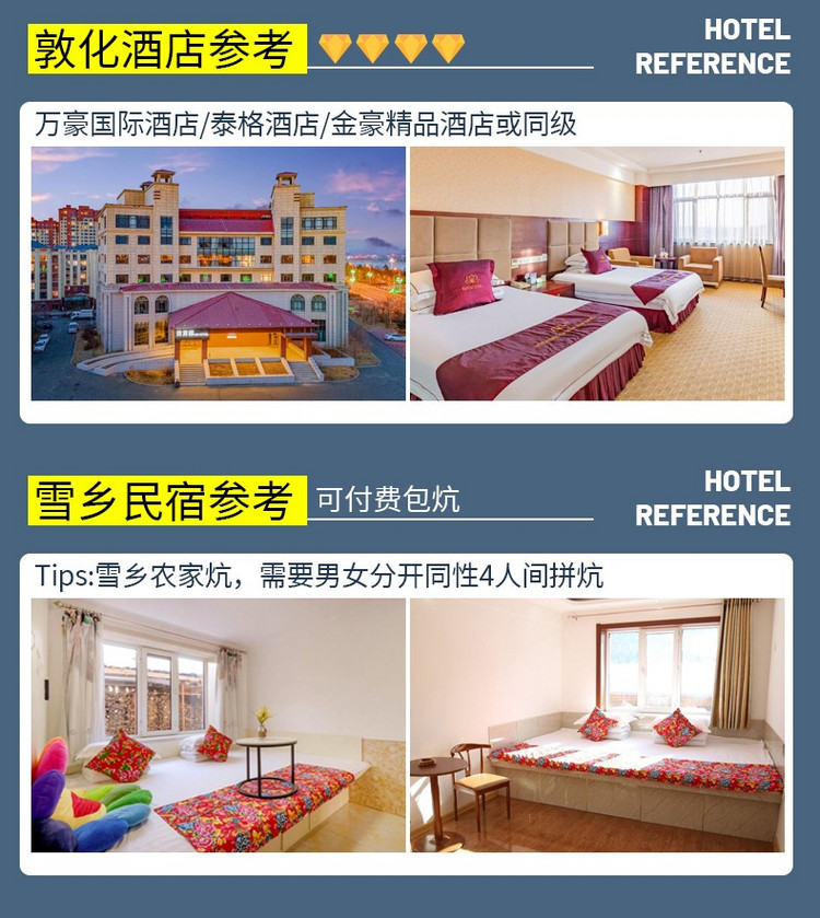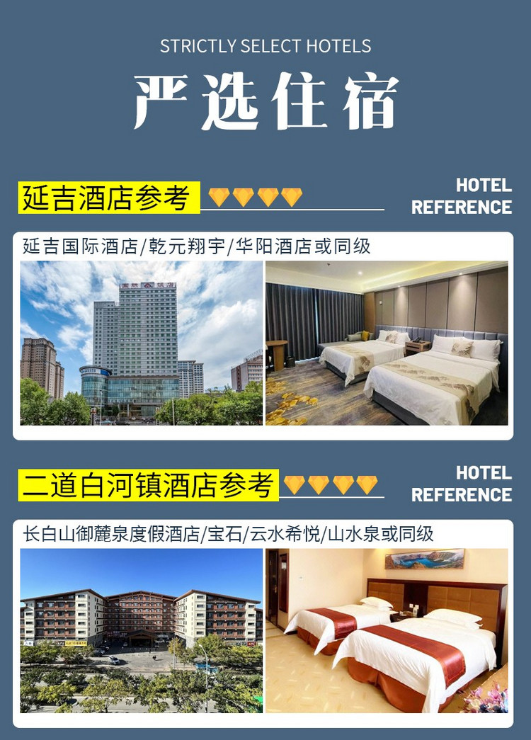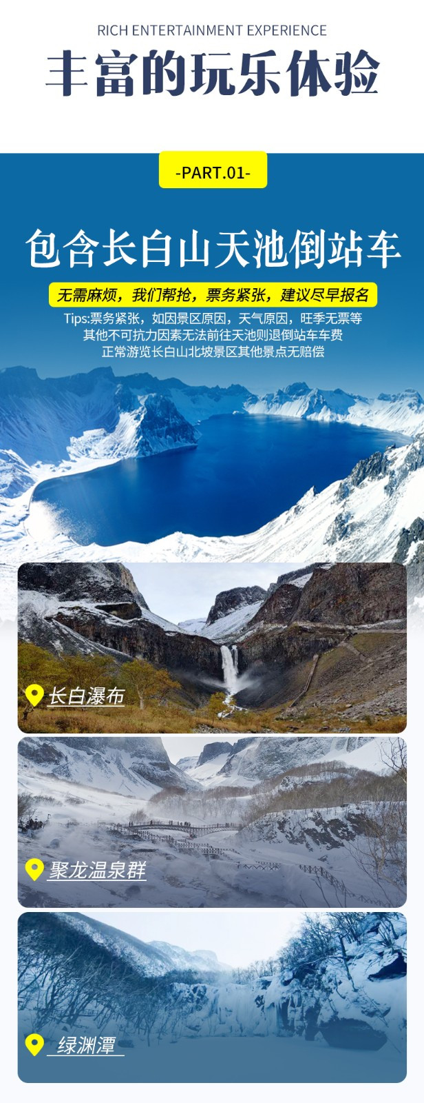 5、长白山由于冬季火爆限流前往,票务紧张,建议尽早报名好提前帮抢长白山天池倒站车票;如因景区原因、天气原因、旺季无票或者其他不可抗力因素无法前往则取消天池游览,退天池倒站车费用其他景点正常游览无退费无赔偿。