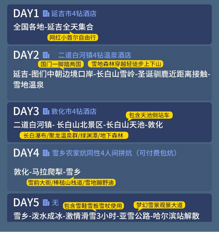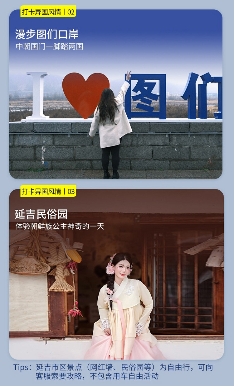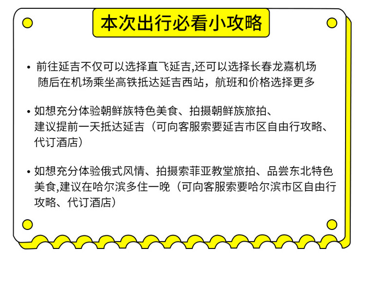 3、除了解散的哈尔滨以外,延吉是行程最大的城市,购物较为方便,如您需要购买个人物品建议在延吉购买。