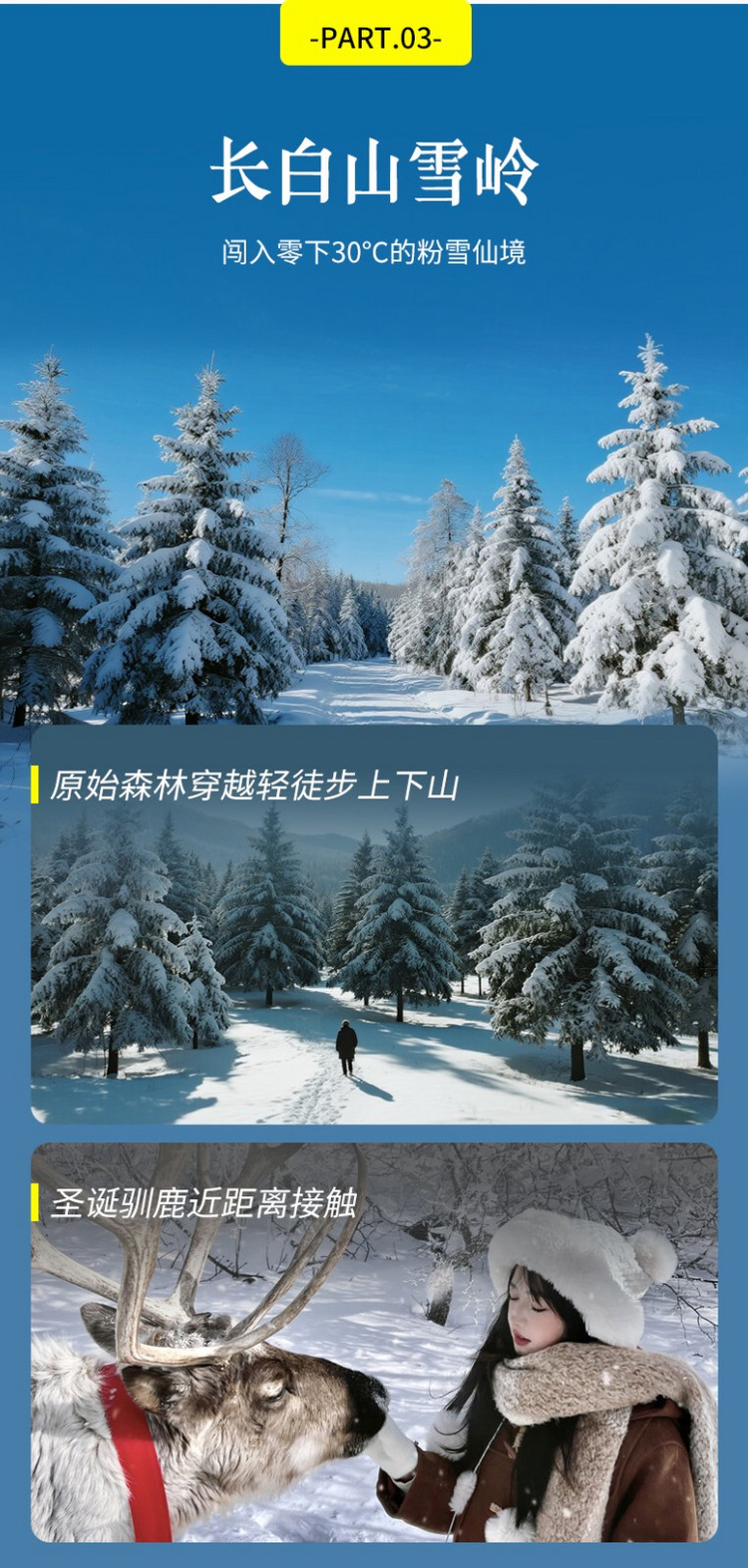 14 : 00抵达【长白山雪岭】,这里冬季的雪最深处可以过腰,脚踩下的每一步都像是陷进蓬松的云里。雾凇森林是凝固的浪涛,雪蘑菇像大地呼吸的泡沫。在零下30℃的寂静中,听雪落枝头的“簌簌”密语。捧起雪抛向晴空,看冰晶折射出钻石星辰;我们在这里进行【森林雪山轻徒步】;走起来深一脚浅一脚,咯吱作响。