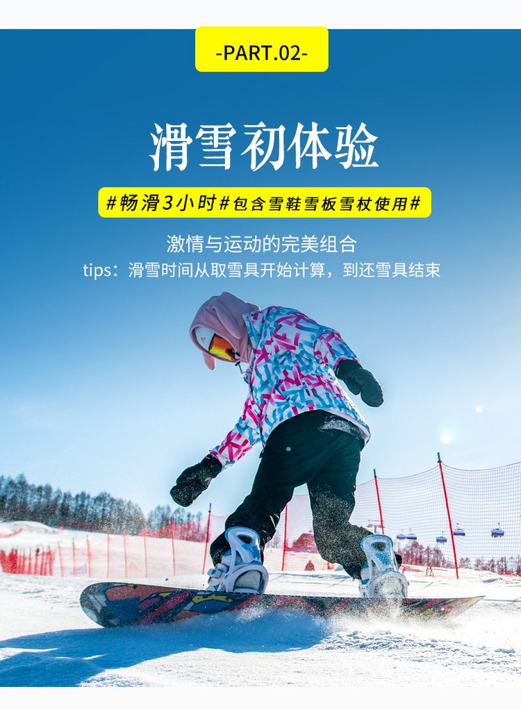 08:30开始【激情滑雪3小时】,站在大山之巅,向未知挑战,是探索或是征服,是勇气还有力量。那种在高速滑行下肾上腺素飙升的快感值得每一个滑雪人为之心潮澎湃,一定要注意安全哦~