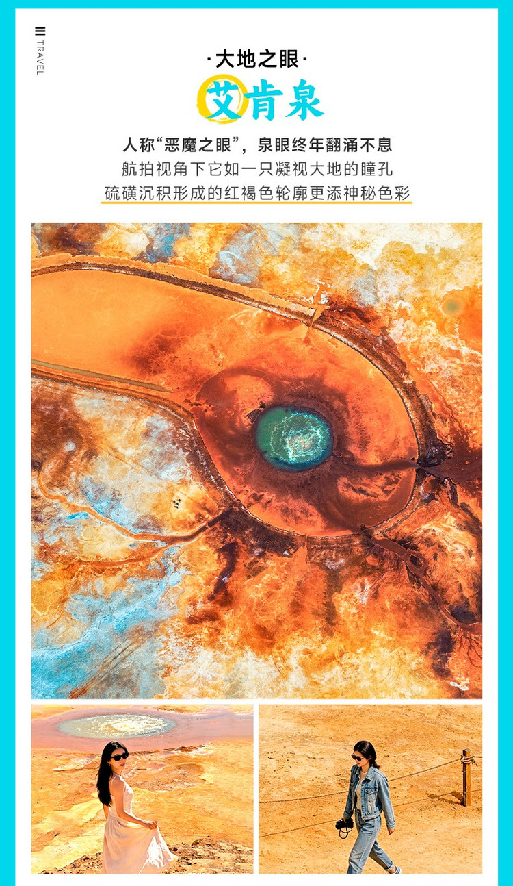 早餐后,前往被誉为“大地之眼”的【艾肯泉】(约35公里,1小时车程,游玩约1.5小时),泉眼终年翻涌不息,周围因硫磺矿物质长期沉淀形成红褐色轮廓,从空中俯瞰宛如一只凝视苍穹的瞳孔,震撼无比。我们特别安排无人机航拍体验,助你捕捉这一地质奇观的全貌,也可以在观景台上用望远镜近距离观察泉眼沸腾的细节,感受地球脉搏的跳动。