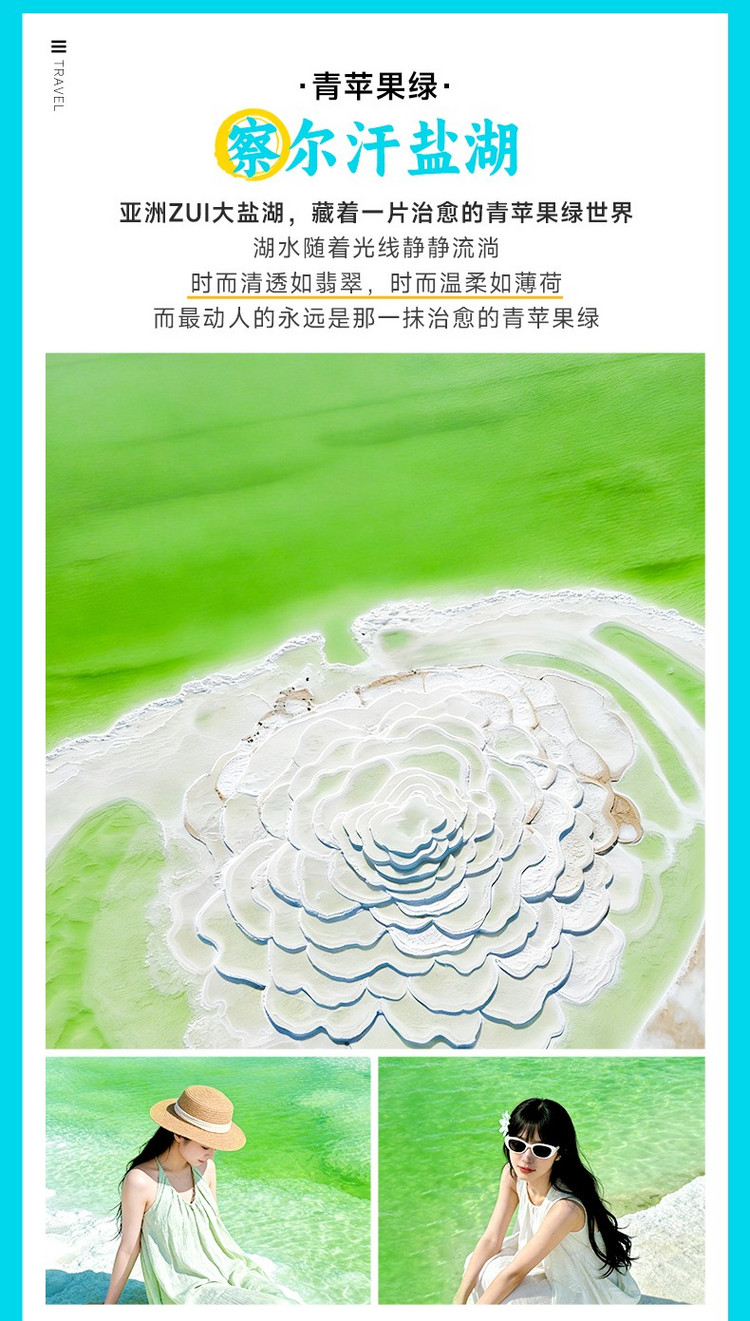 中午,乘车前往【察尔汗盐湖】(约257公里,3小时车程,游玩约2-3小时),这里不仅是亚洲zui大的盐湖,更是一处会呼吸的色彩艺术馆,这里的湖水就像被施了魔法,有时候是清透的苹果绿,有时候是温柔的薄荷青,在纯白盐晶的映衬下,宛如大自然打翻的调色盘。阳光洒落时,湖面泛起粼粼波光,那一抹青绿仿佛有了生命,随光影流转而变幻深浅。