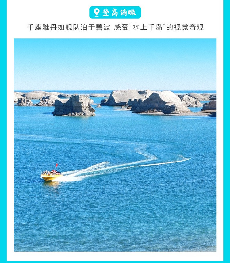 酒店早餐后,沿315国道西行前往乌素特【水上雅丹】(约270公里, 4.5小时车程,游玩约2-3小时)。这里是国内仅有的水上雅丹地貌群,被誉为“荒漠千岛湖”。千百座风蚀土丘散落在湛蓝湖水中,形如整装待发的远航舰队,气势恢宏。登高远眺,湖水环绕雅丹,光影交错间随手一拍皆是视觉大片。