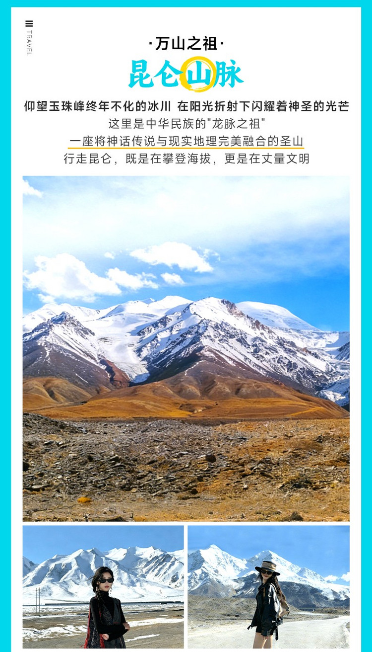 随后抵达【玉珠峰观景台】(停留约20分钟)拍摄昆仑山东段最高峰(6178米)的雄姿,冰川在阳光下熠熠生辉,观景台设有海拔标识碑,是记录行程的绝佳取景点,若天气晴好,可清晰看到完整的雪山轮廓和冰川地貌。
