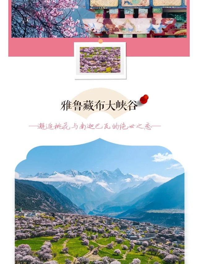 雅鲁藏布大峡谷是3.4月赏桃花的首选之地。两岸的山坡上,桃林与麦田交相辉映;三面环山的桃花,江水倾泻而下,涧边长满了野生桃树,只可远观不可近玩。