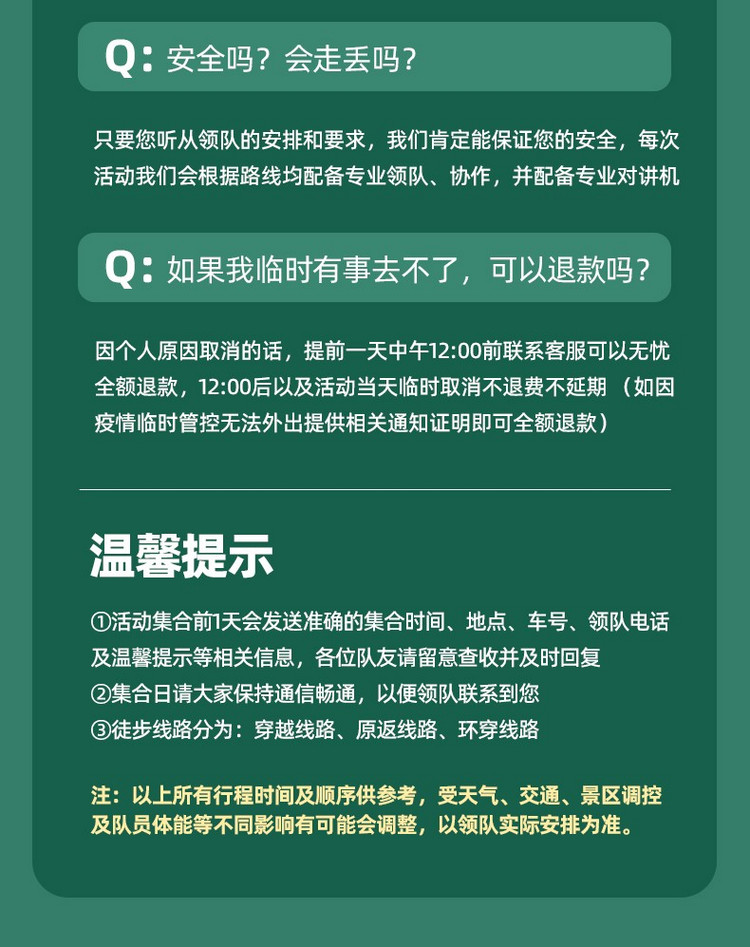 注:以上时间为预计时间,中途如遇塞车,修路等问题,领队有权调整行程。
