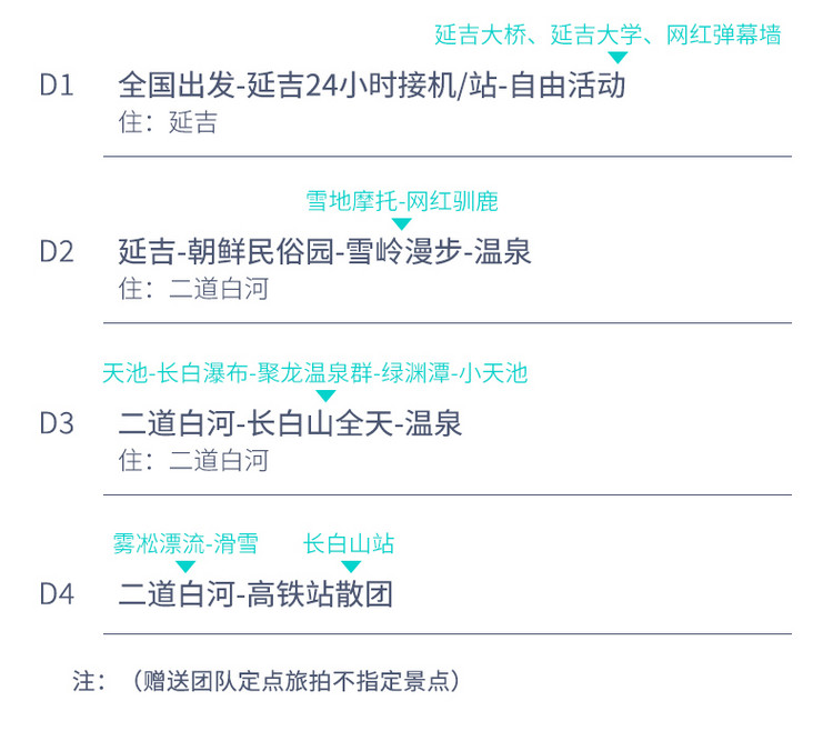4、长白山景区由于最新政策需要预约,每天限流参观,团队参观时间严格按照预约场次进行;因此,景点参观顺序会按照预约时间进行调整或同团客人安排不同时间游览,敬请配合。如未能预约成功,无法安排游览,我们将调整行程前往游览“雪山飞湖”景区(退差价),望您谅解。