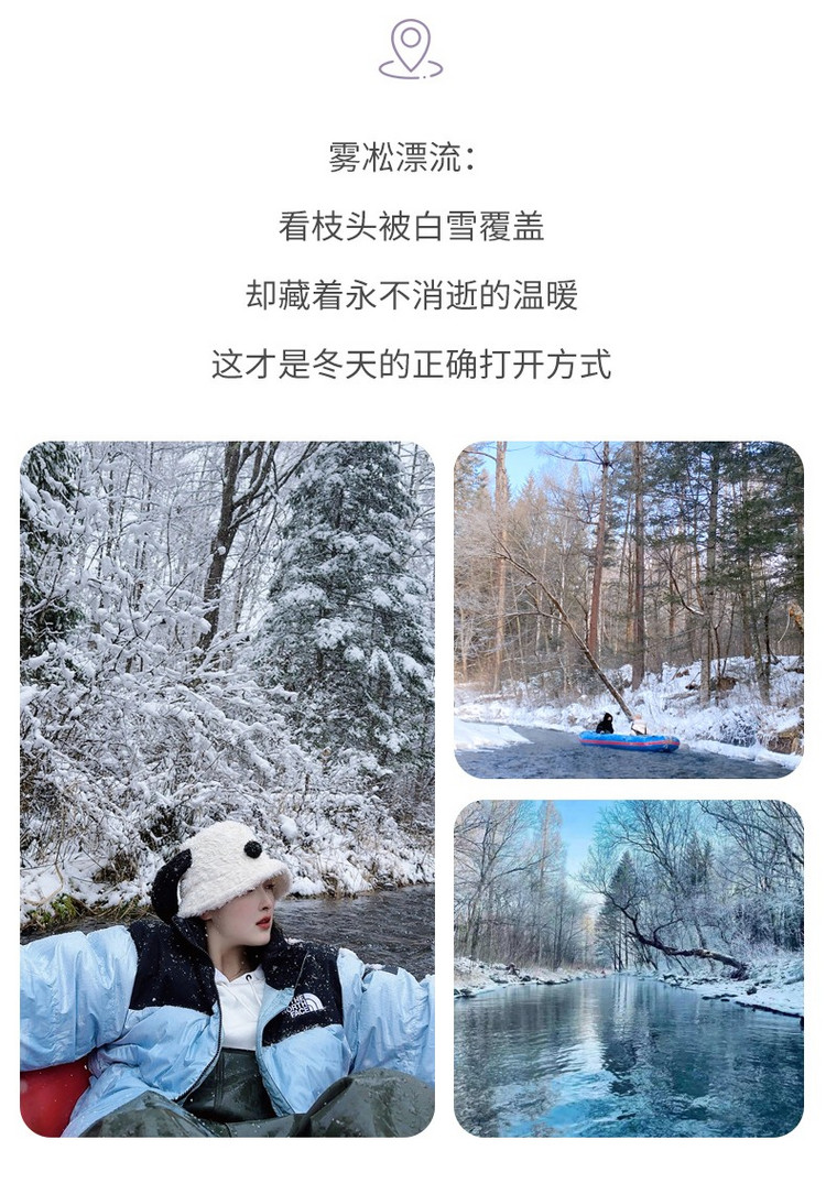 06:30 抵达【雪地漂流】,当气温达到零下二三十度时,万物都被白雪冰凌覆盖,而航线上只有一条温泉河流静静流淌。漂流在雪林之中,看着两岸雾凇树挂(视天气情况),一派“船在水上漂,人在林中游”的意境。
