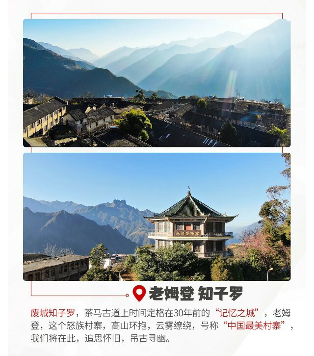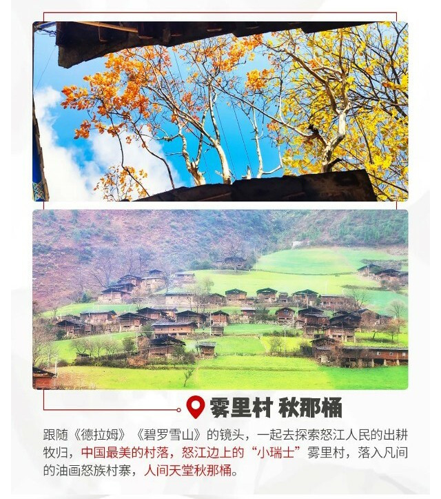之后,我们穿越茶马古道,零距离接触被《国家地理杂志》评为中国最美的村落之一的油画小村【雾里村】。田壮壮导演在此拍摄的纪录片《德拉姆》、刘杰导演在此拍摄的《碧罗雪山》,都记录了这个怒江边上的“小瑞士”出耕牧归的幽然。
