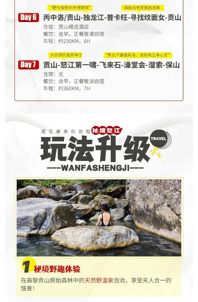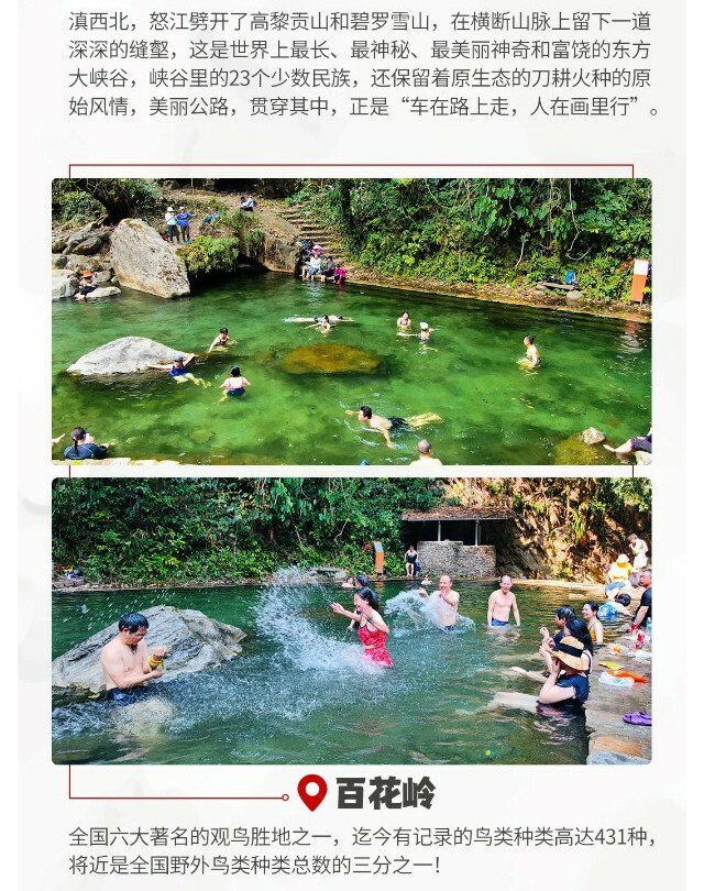 之后前往【百花岭】,走进小众秘境——高黎贡山,这里有着尚未开发的【野生温泉】—阴阳谷温泉!高黎贡山被誉为“世界物种的基因库”,原始森林中,物种何其丰富。飞溅的瀑布打在野芭蕉叶上,变成一颗颗晶莹剔透的露珠滑落。深山中,迷雾缭绕,两眼温泉从火山岩层间涌出!每到过年过节的时候,当地人就会来到这里,用温泉水祛病养生!我们要在这里感受空谷幽林,鸟儿齐鸣的森林泡汤。