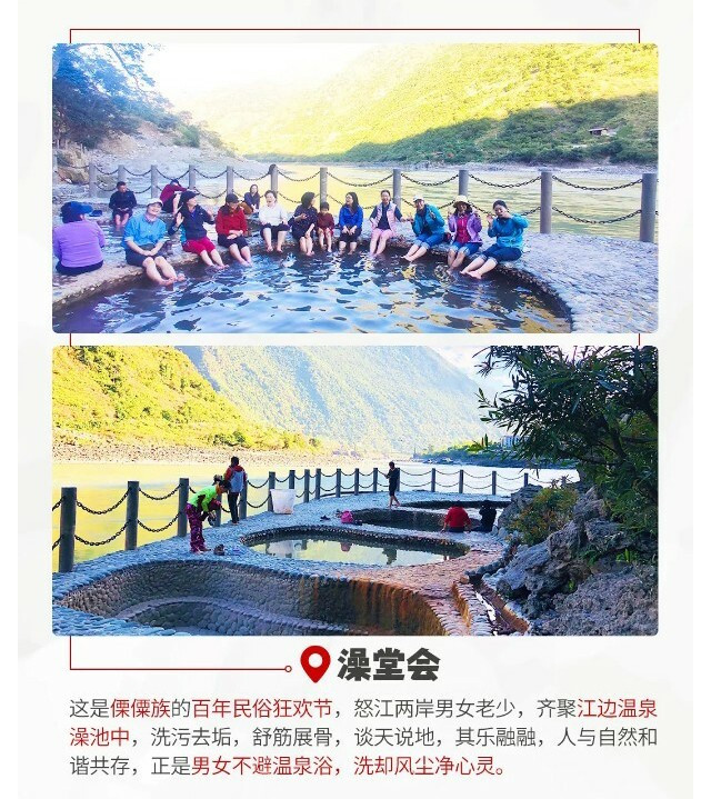 之后驱车直下,抵达【澡塘会址】,这是怒江特有的天然温泉群。每年春节初二到初七,附近的傈僳人,相聚到此,男女老少互不避讳,自然洗浴,互聊家常,其乐融融,与旁边兀自奔流的怒江和谐共存。有诗赞“男女不避温泉浴,洗却风尘净心灵”。