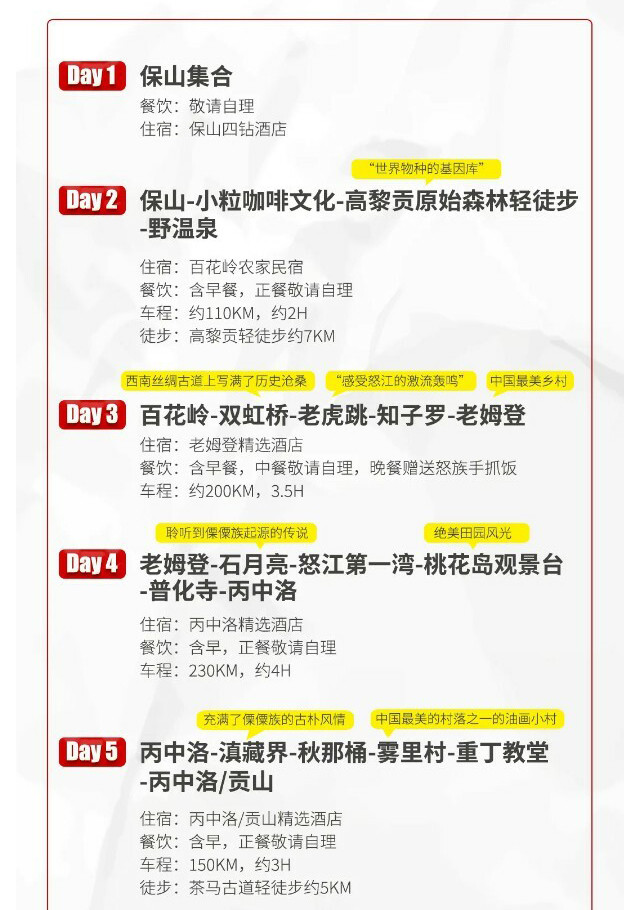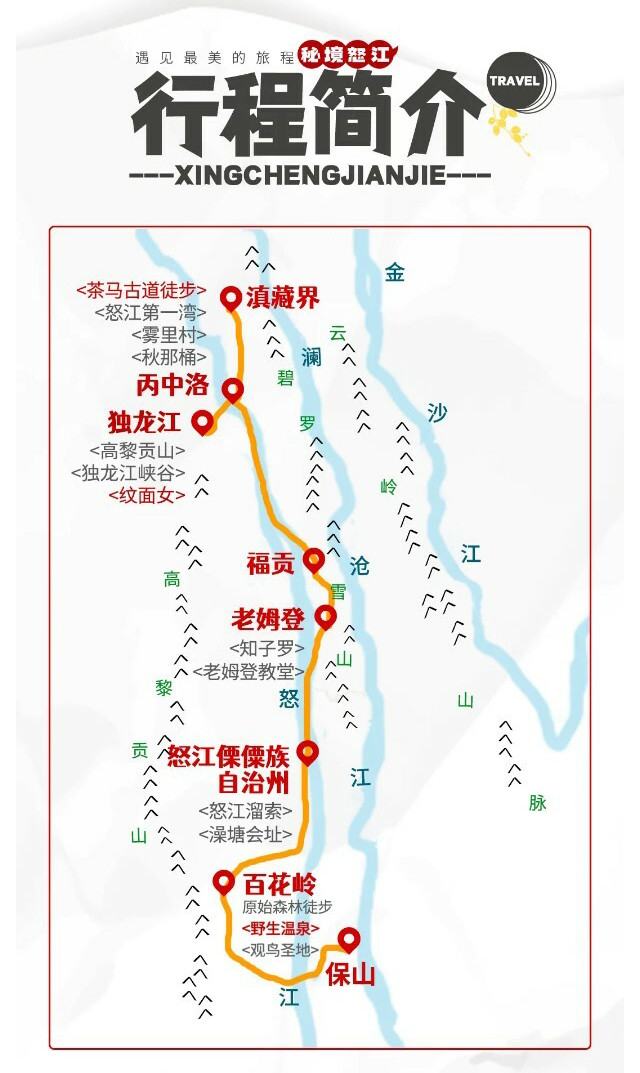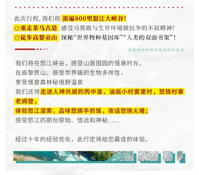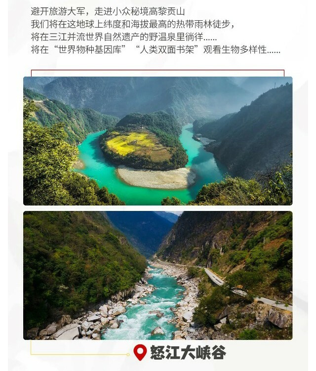 1、独龙江位于祖国边境,山高路远,若因不可抗力(堵车、道路塌方等)或政策因素无法进入,领队将会对行程做适当调整,保证行程的顺利进行;