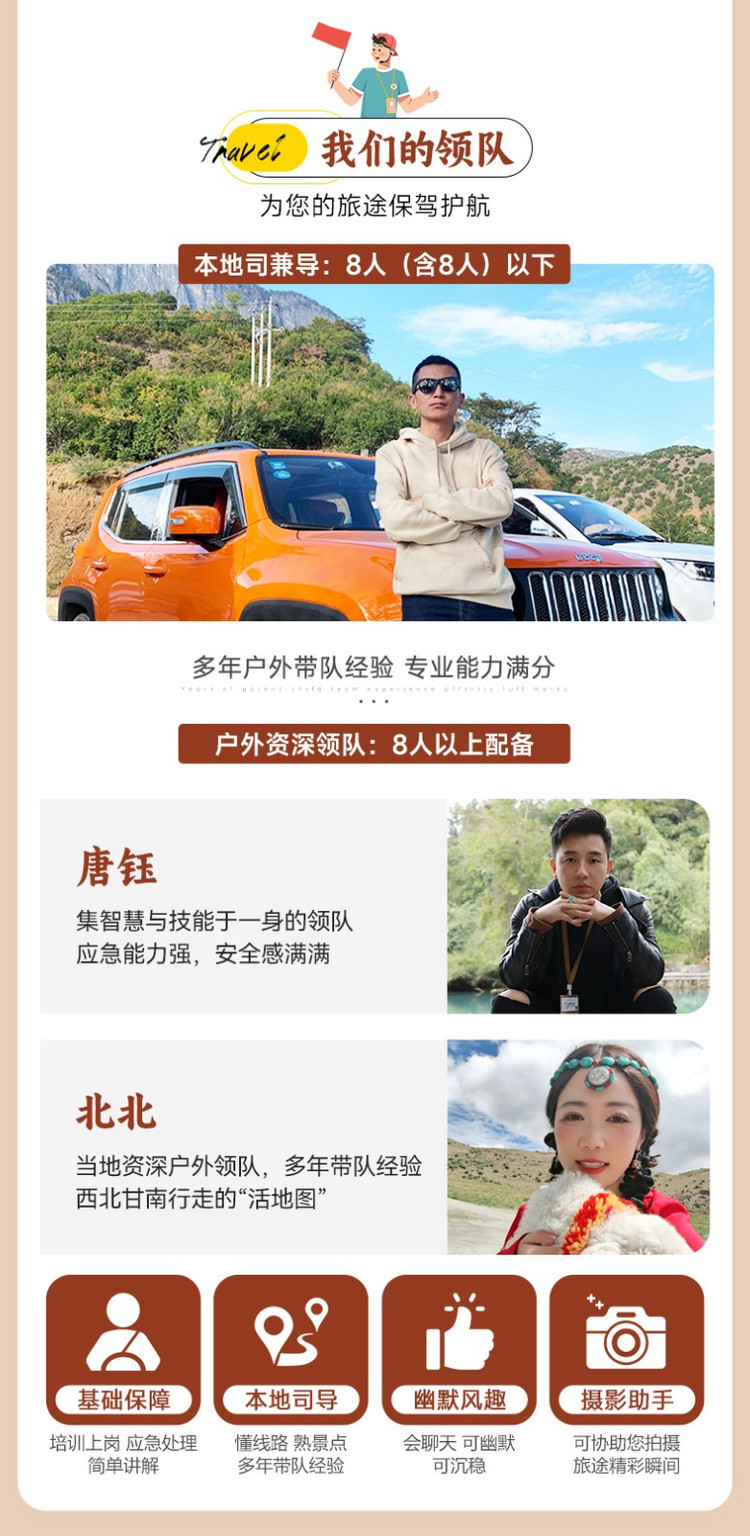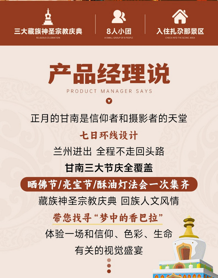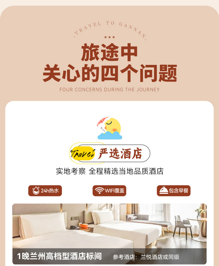 2、我们会在出发前三天以短信的方式通知您集合酒店及领队联系方式,领队会在出发前一天下午18:00前联系您,请您保持电话畅通。到达酒店前台报【甘南晒大佛+姓名】凭有效证件办理入住手续(酒店一般入住时间为14:00之后,如您到达较早,可将行李寄存在前台,自行在市区逛逛)