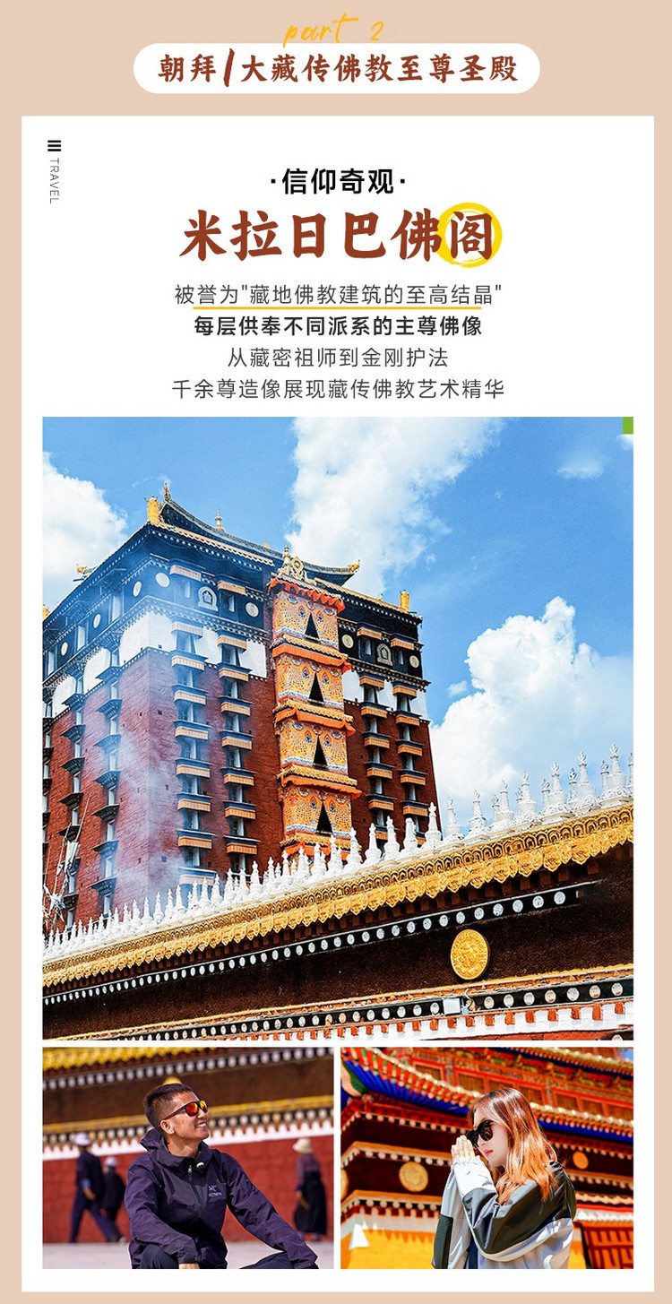 早餐后,我们集合乘车前往安多合作【米拉日巴佛阁】(行程约:230KM,车程约3小时,游玩约1小时),佛阁共有9层,每一层都是一个单独的佛堂,每一层代表着不同的教派,供奉的主尊均不相同。所以又名“九层佛阁”,是为藏传佛教白教的代表建筑,为纪念米拉日巴而修建的佛阁。米拉日巴是藏传佛教史上最富传奇色彩的一位大师,是噶举派(白教)创教者之一。外观宏伟,色彩浓烈,内部金碧辉煌,绘满了壁画,阁外设有转经筒。在整个藏区共有两座米拉日巴佛阁,合作的这座便是其中之一。